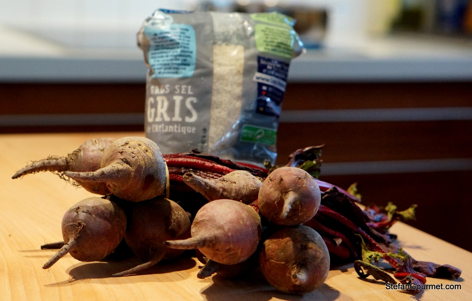 Meanwhile, it was time to start thinking about the beets. I preheated the oven to 190ºC/375ºF (with fan). I trimmed the beets, but didn’t peel them, and arranged them in an oven dish on top of a layer of coarse sea salt.