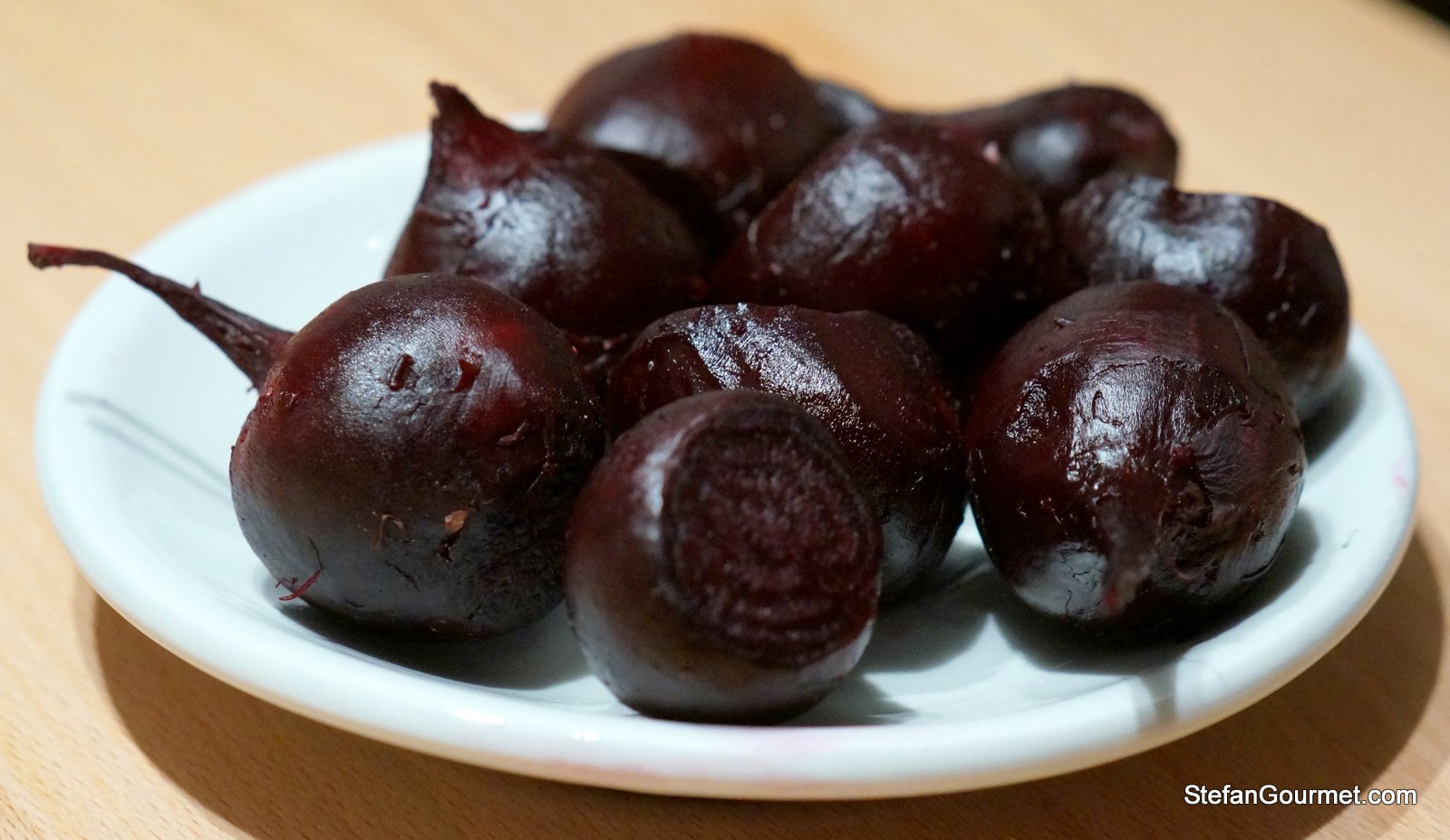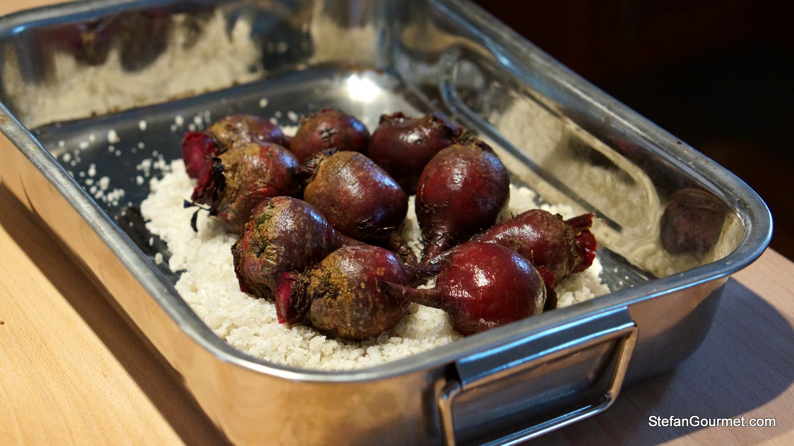 I roasted the beets in the oven at 190ºC/375ºF (with fan) for 75 minutes or until they were tender (when pierced with a fork). I allowed them to cool before breaking open the salt crust that had formed.