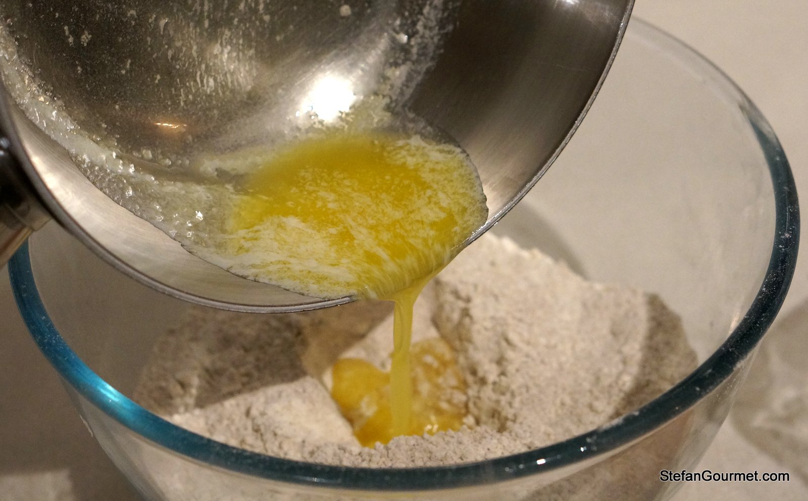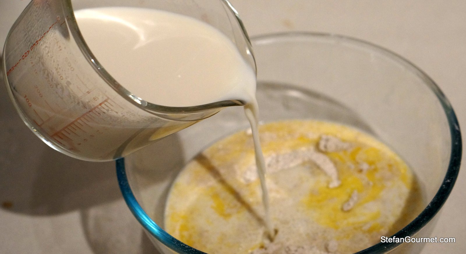 Warm up the milk in the microwave to lukewarm. Add the crumbled fresh yeast and the sugar and stir to dissolve the yeast.