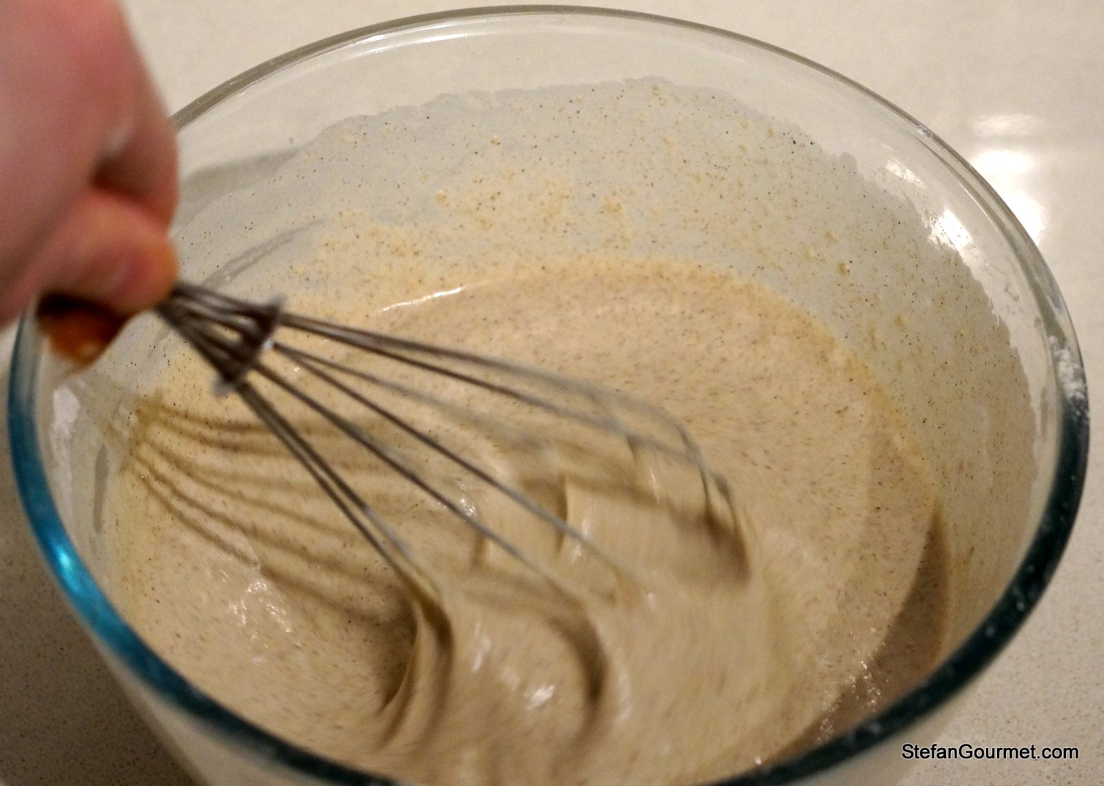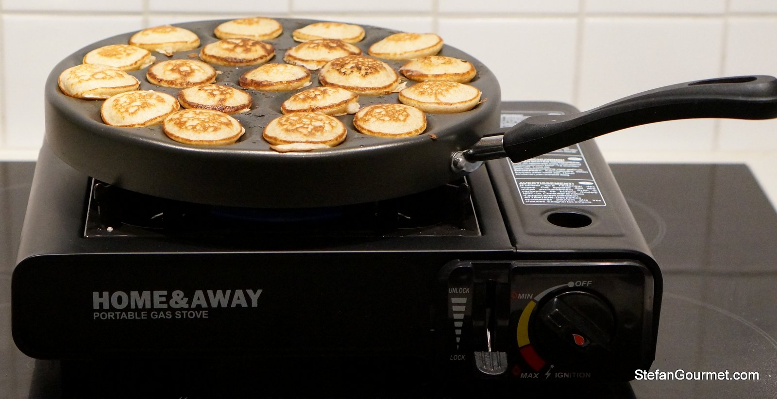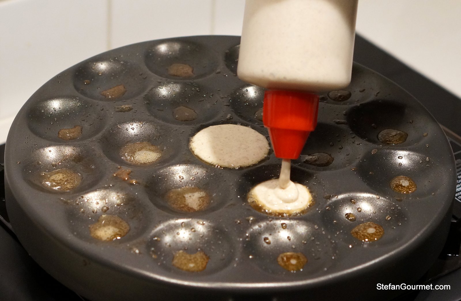 A poffertjespan can be either heavy and cast iron, or aluminum and non-stick. I had picked up the latter (cheaper) variety, and also needed to purchase a portable gas stove as the aluminum poffertjespan doesn’t work on my induction stove. Just like oliebollen and appelflappen, poffertjes should be eaten fresh while they are still warm. Poffertjes are often made with buckwheat flour for additional flavor.