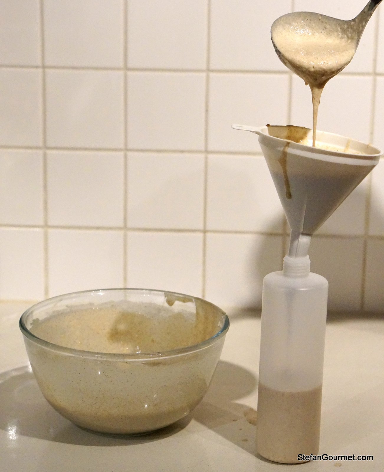 It is much easier to dispense the batter with a squeeze bottle, so transfer the batter to such a bottle using a funnel.