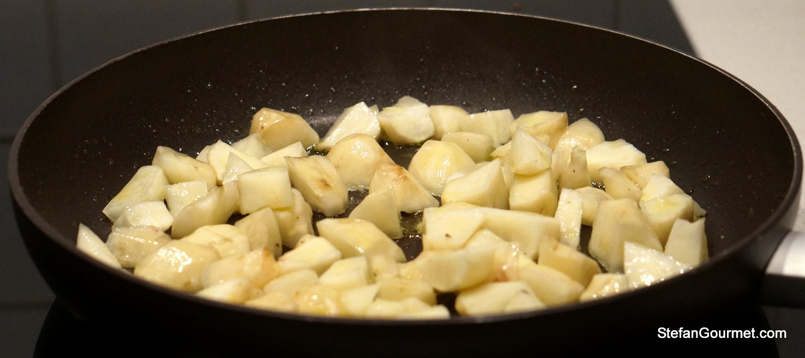 Heat about 25 grams (2 Tbsp) butter in a non-stick frying pan and sauté the jerusalem artichokes over medium high heat until they are golden (about 5 minutes).