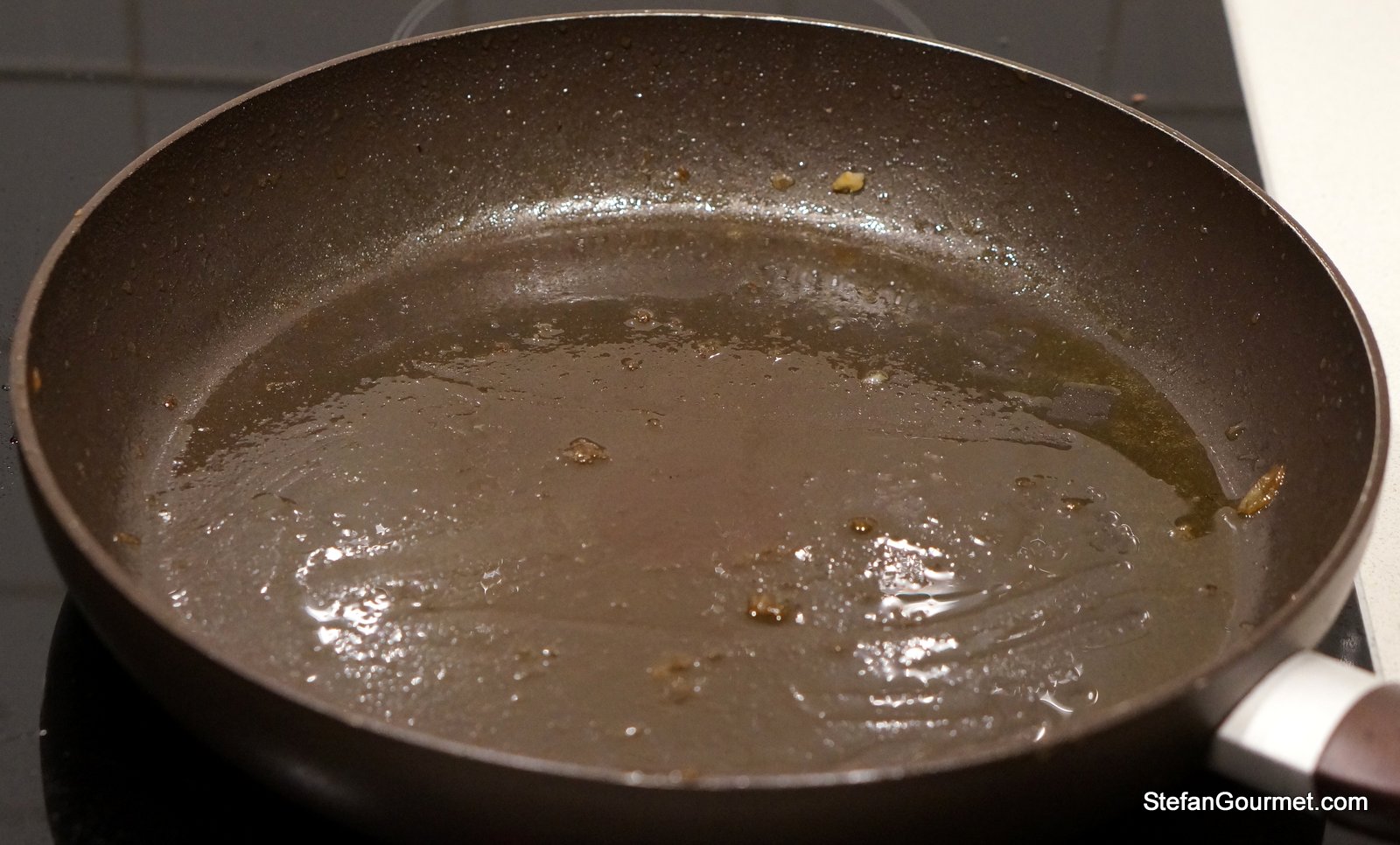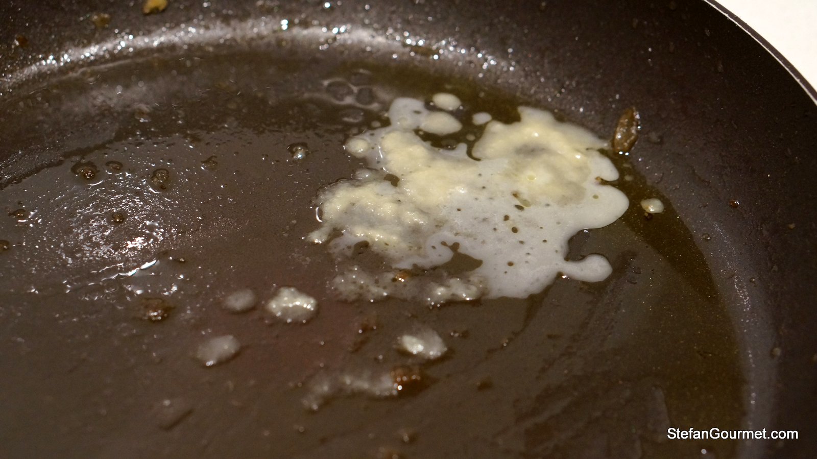 Melt the remaining 50 grams (4 Tbsp) butter in the same pan that you used before over low heat, and stir to mix it with the juices that were still in the pan.