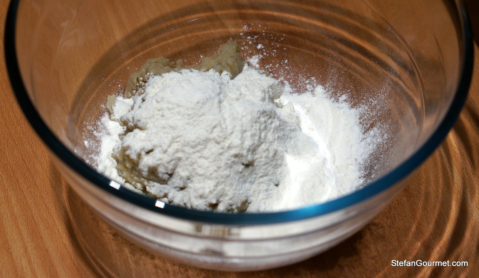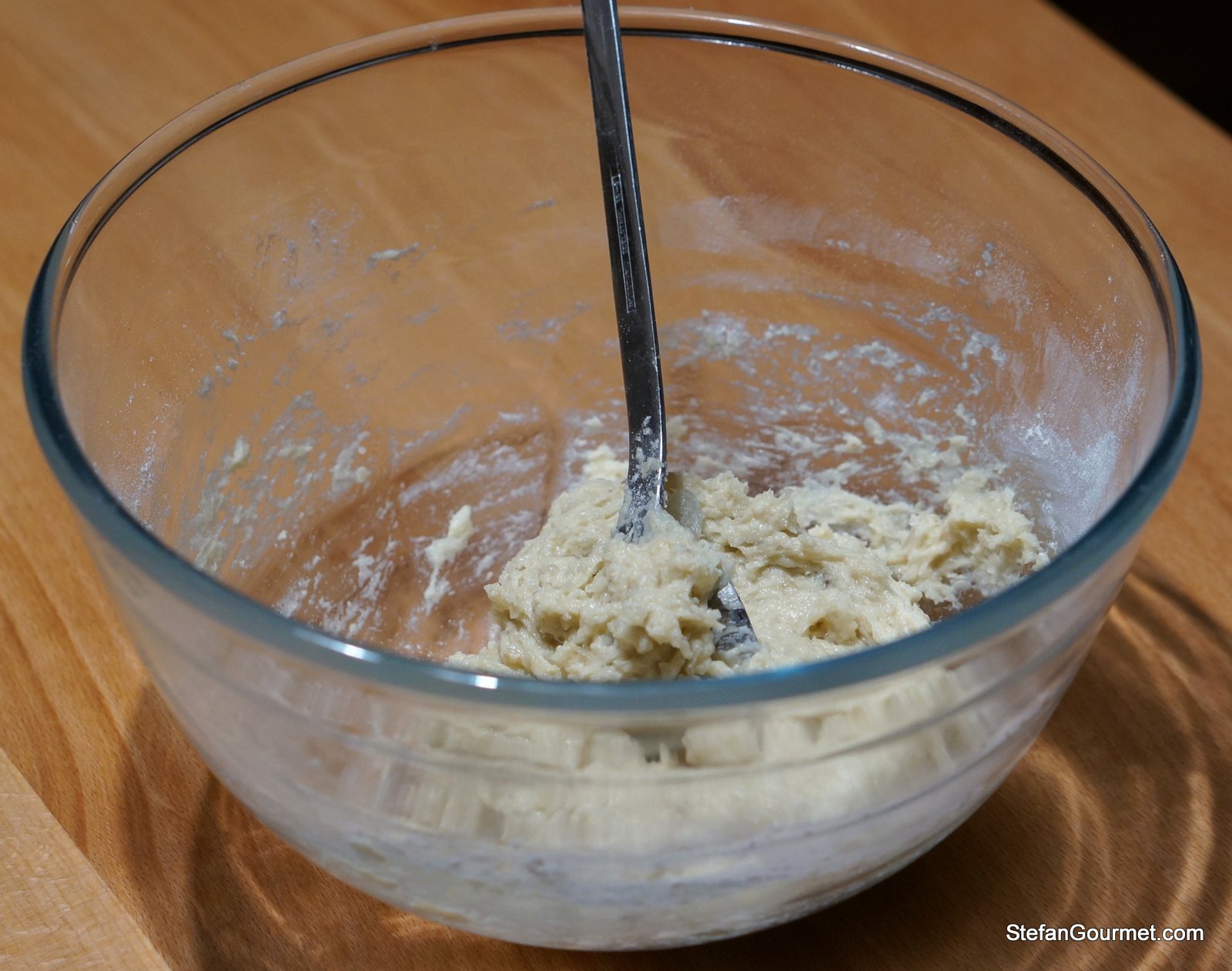 Transfer the dough to a work surface, preferaby wooden, which has been sprinkled with flour. Knead the dough briefly but not longer than necessary. The dough should be dry enough to handle, but still slightly sticky.