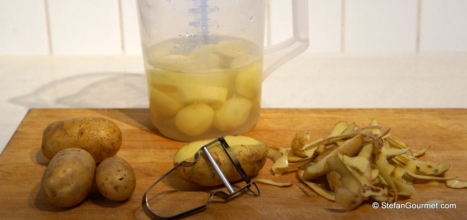 Peel the potatoes and cut them into chunks. Reserve the peels and soak the potatoes in cold water.