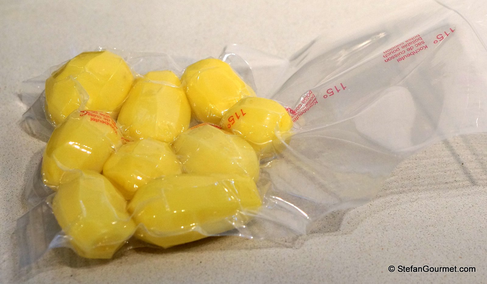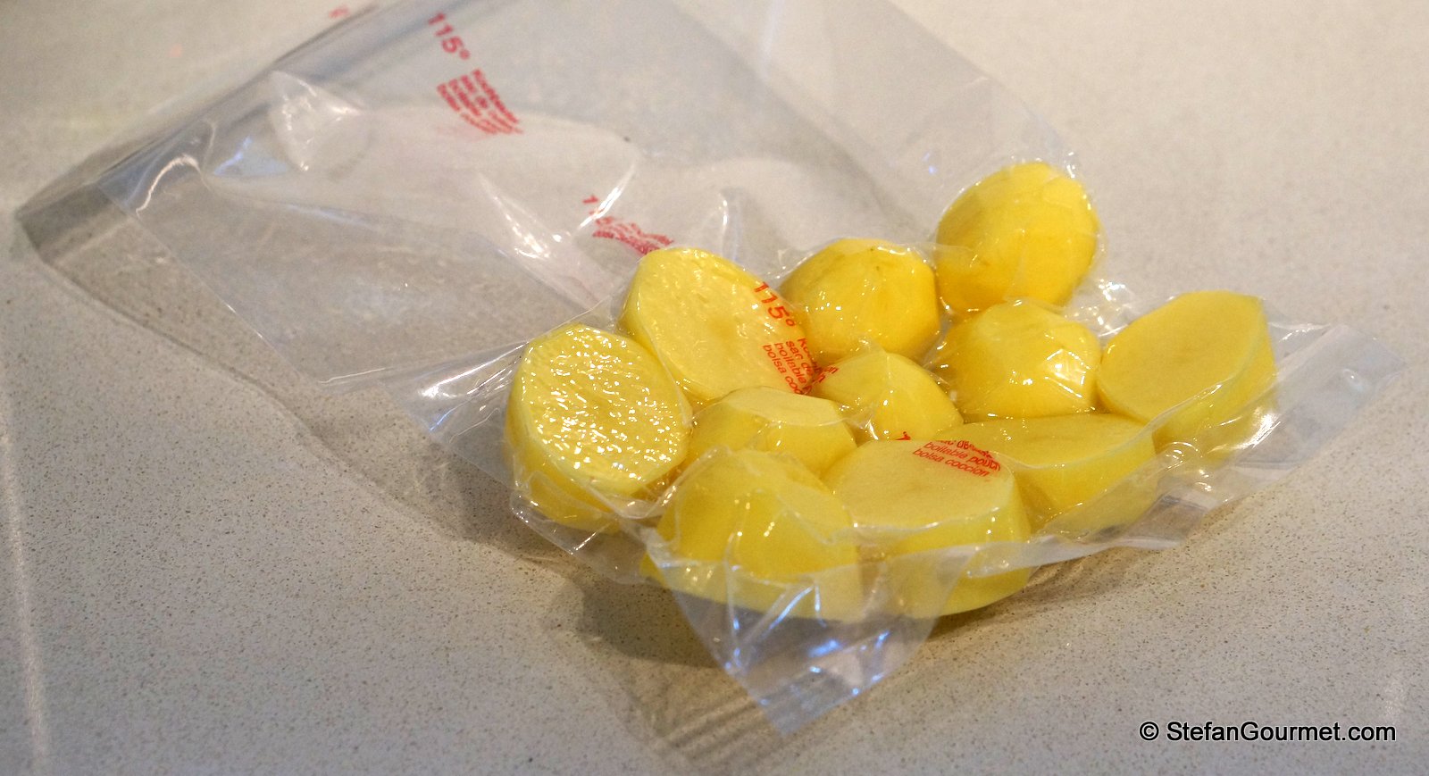 The potatoes will obtain a brown color. Although this is not completely clear in the book, I think it was intended to remove this and so we did. Vacuum seal the potatoes with olive oil until needed.
