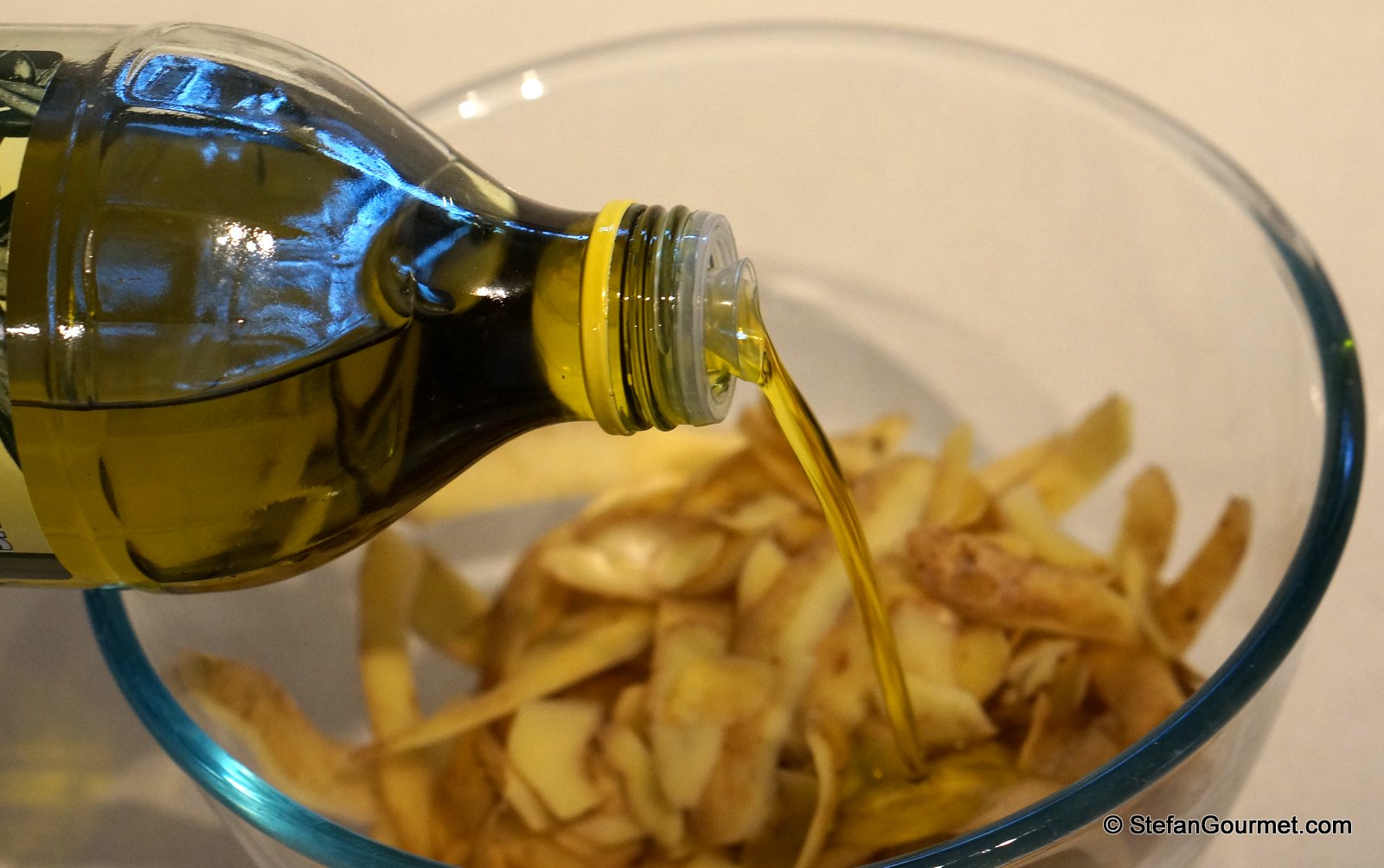 Meanwhile, combine the potato peels with olive oil.