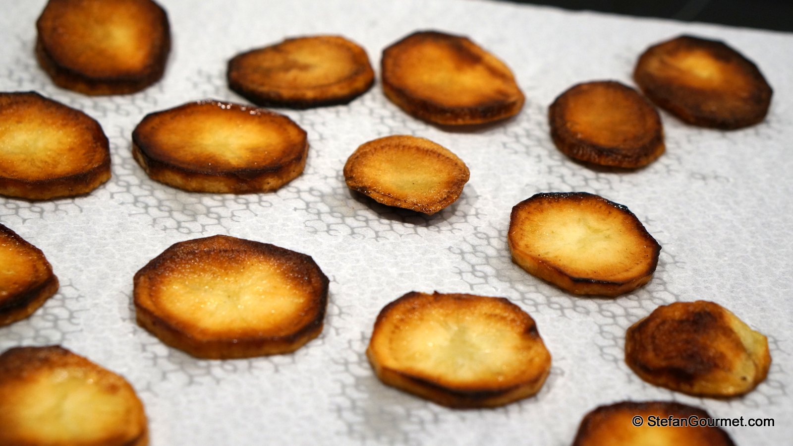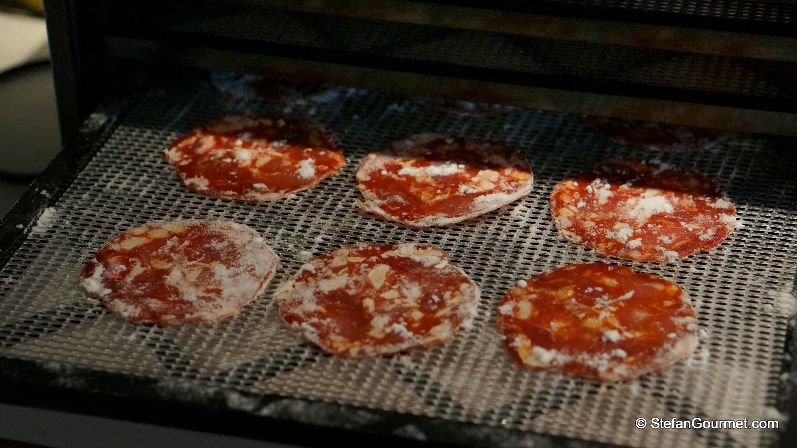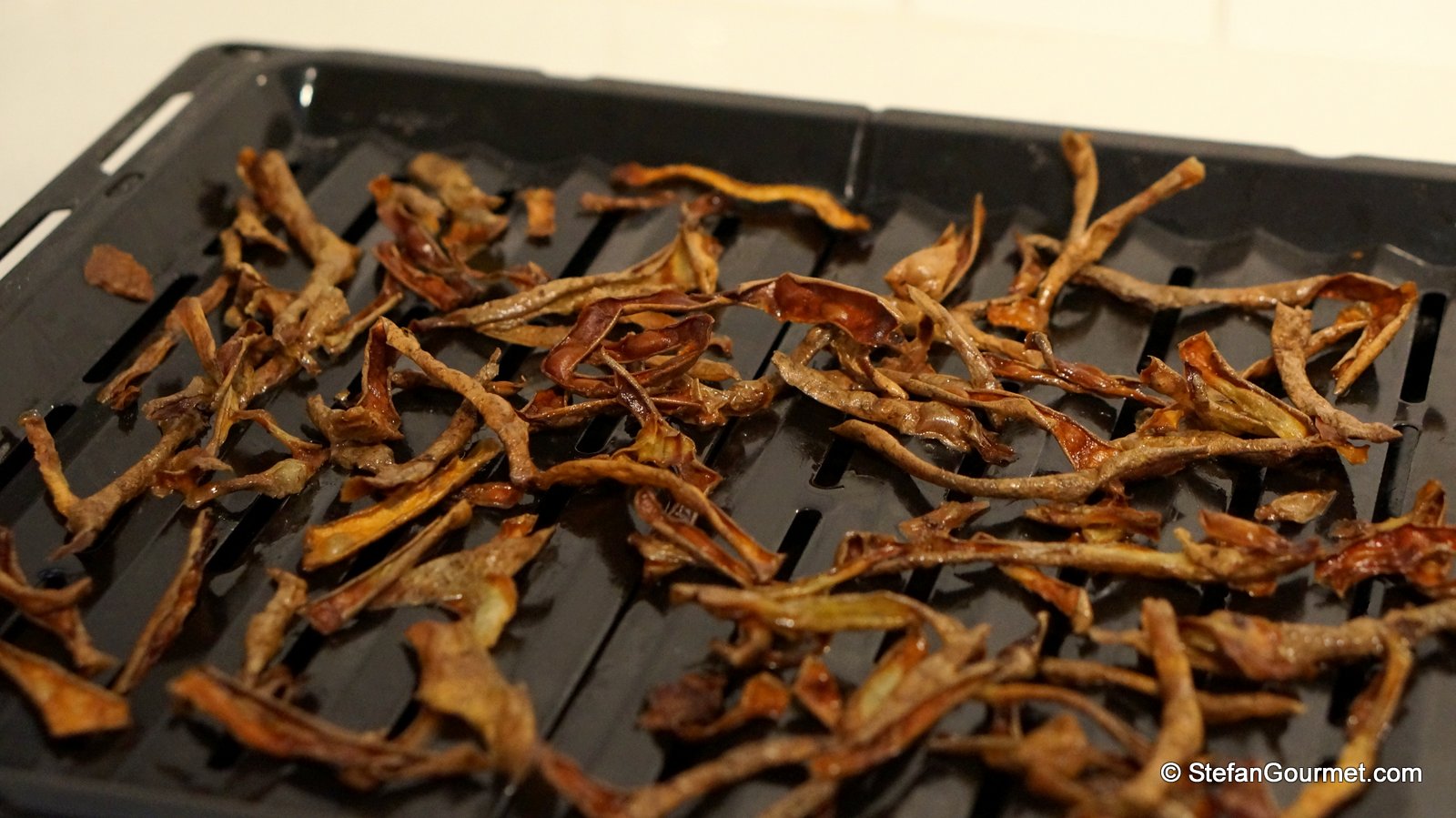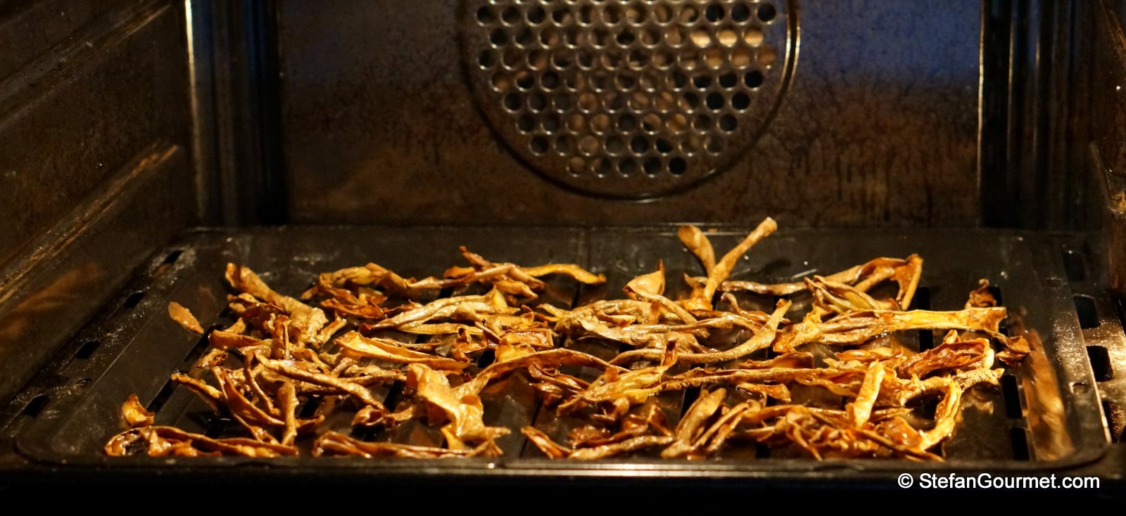 Dehydrate them in the oven for 7 hours at 95ºC/200ºF until golden and completely desiccated as prescribed by the book, or for an hour at 150ºC/300ºF to save some time.
