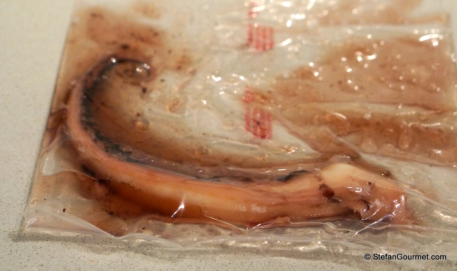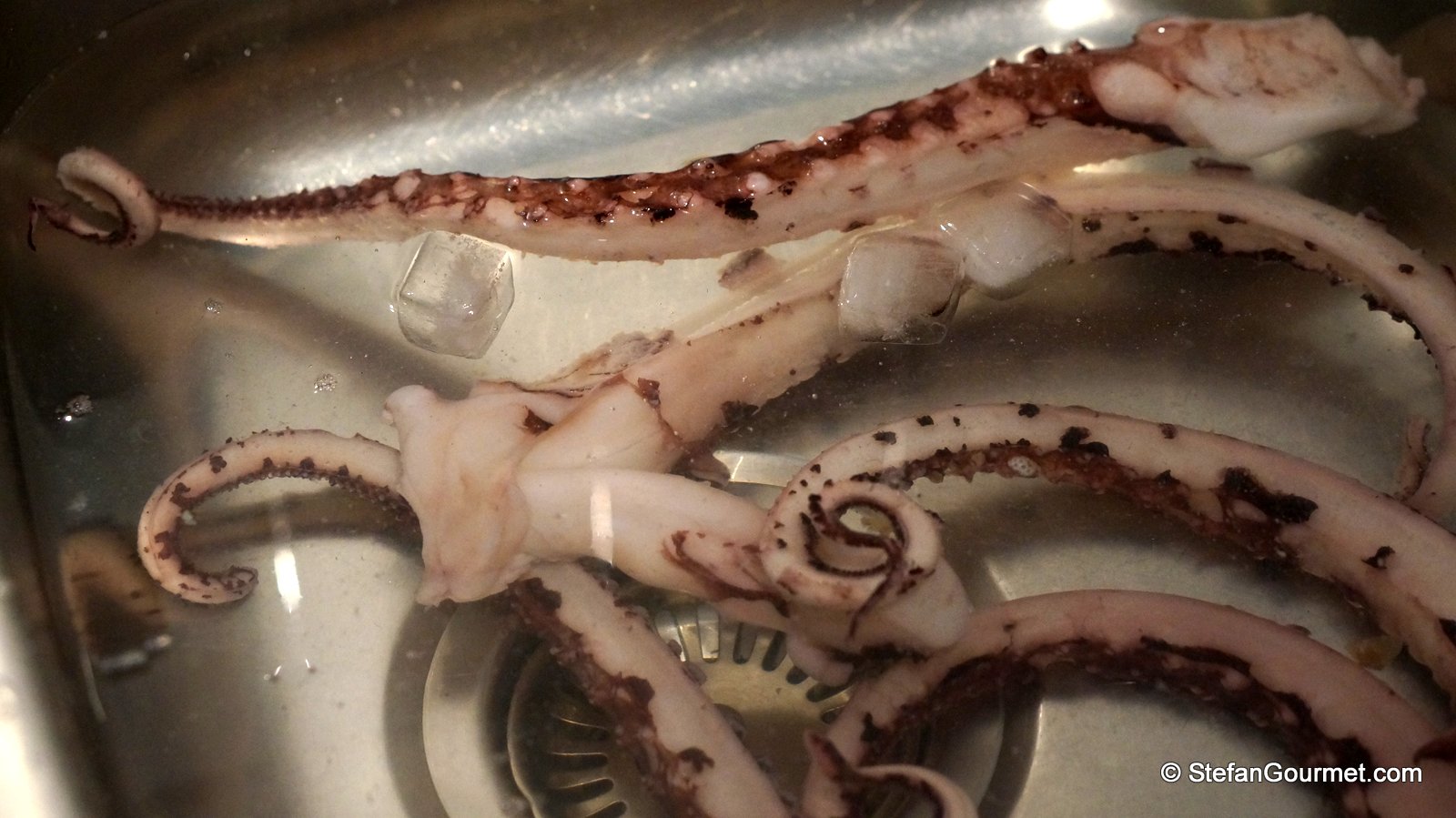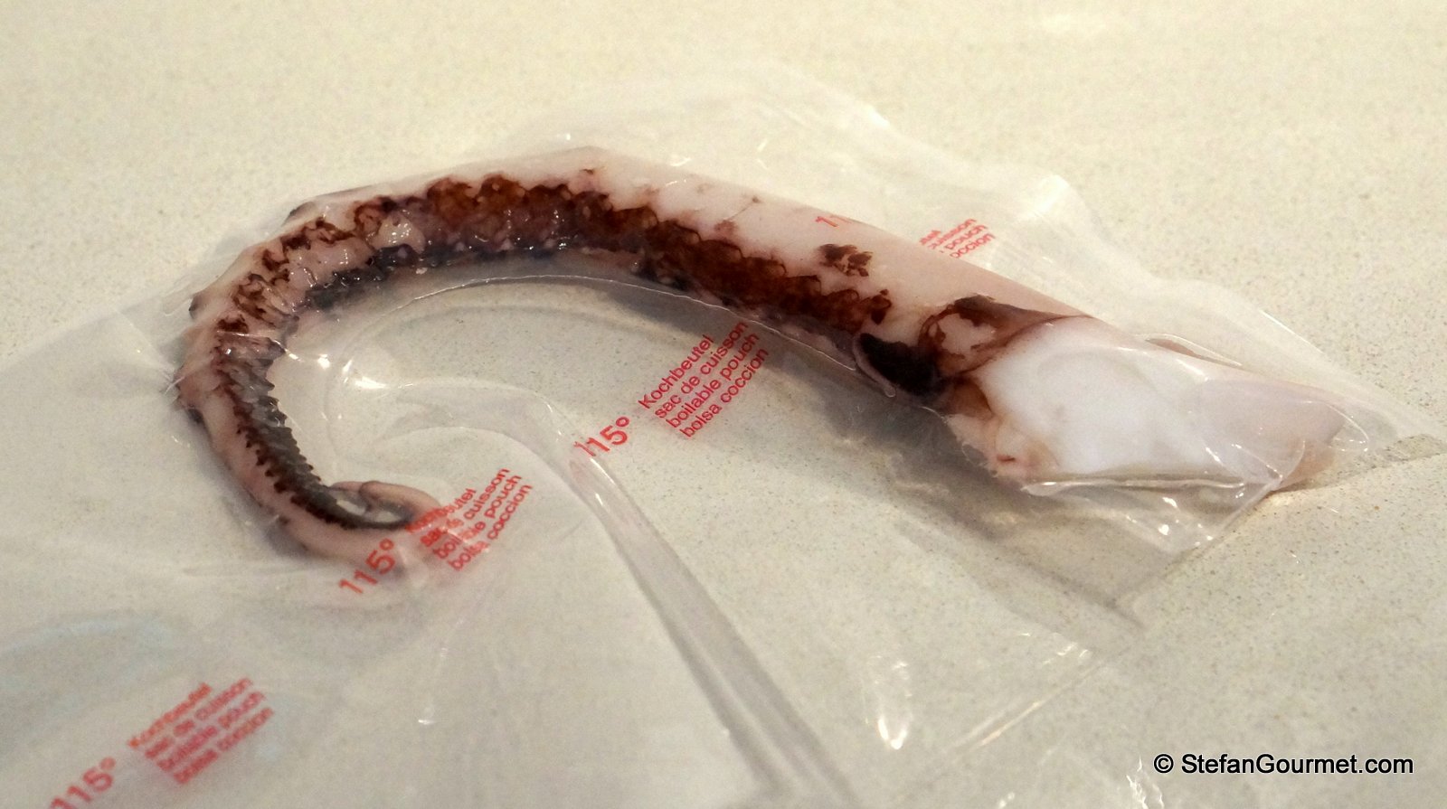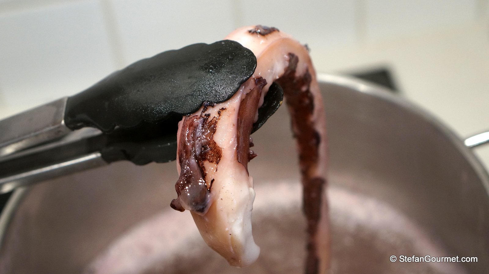 1. I was wondering, because I always cook it sous-vide first. This makes it tender although it still is recognizable as octopus. (Even if you don’t have sous-vide equipment, you could still cook it sous-vide if you wanted in a stock pot using a ziploc bag, as the temperature at which to cook octopus sous-vide is not very critical.)