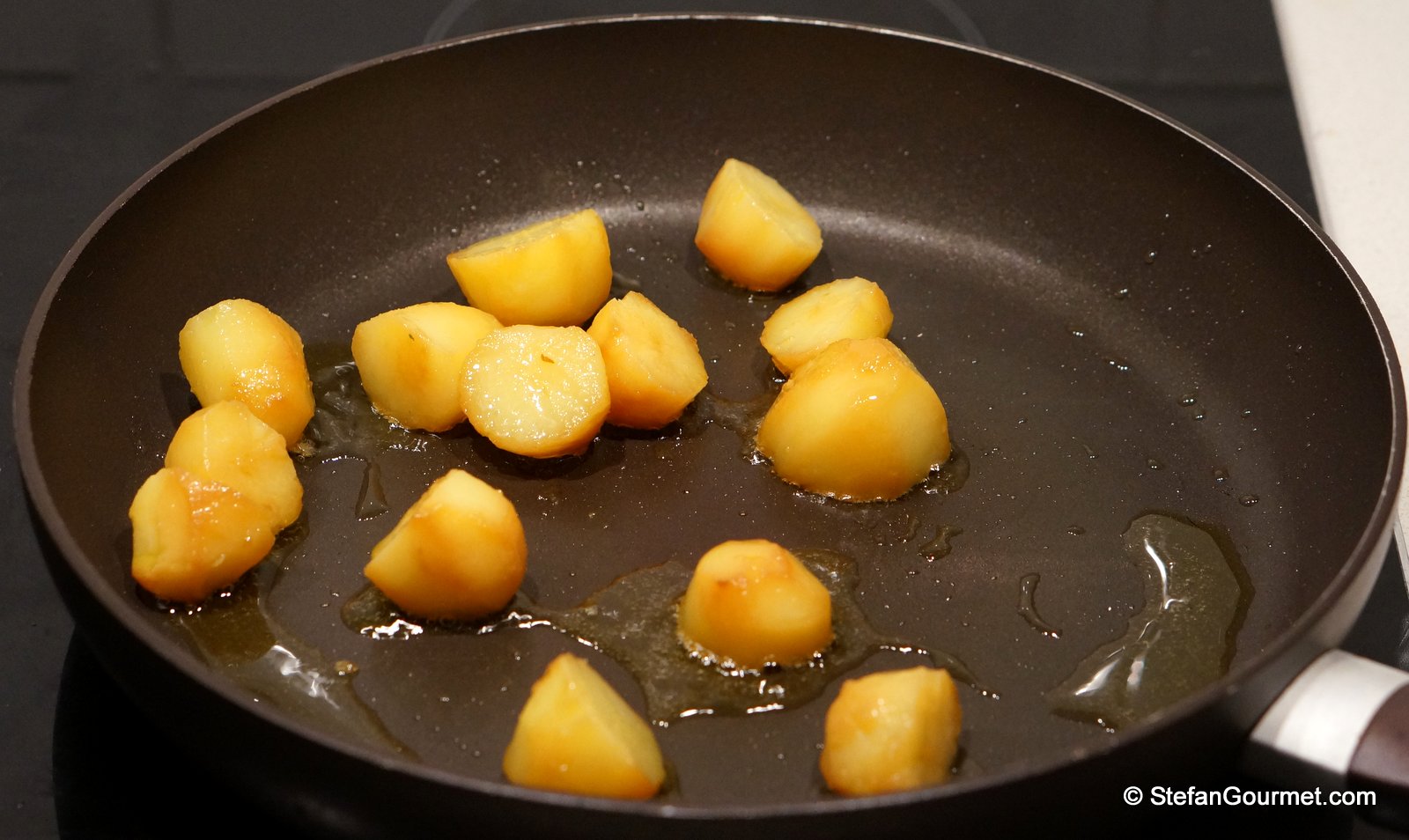 Sear the potato confit until golden.