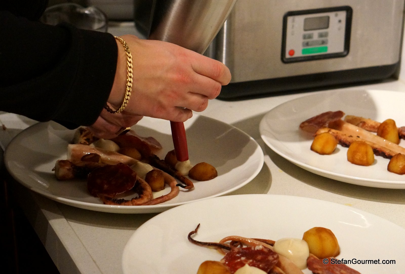 In terms of special equipment, the Pulpo a la Gallega ‘only’ requires sous-vide equipment, a dehydrator, and a whipping siphon. We simplified things by using good quality store-bought chorizo rather than making our own, which was listed as an optional step that would take another 3 days.