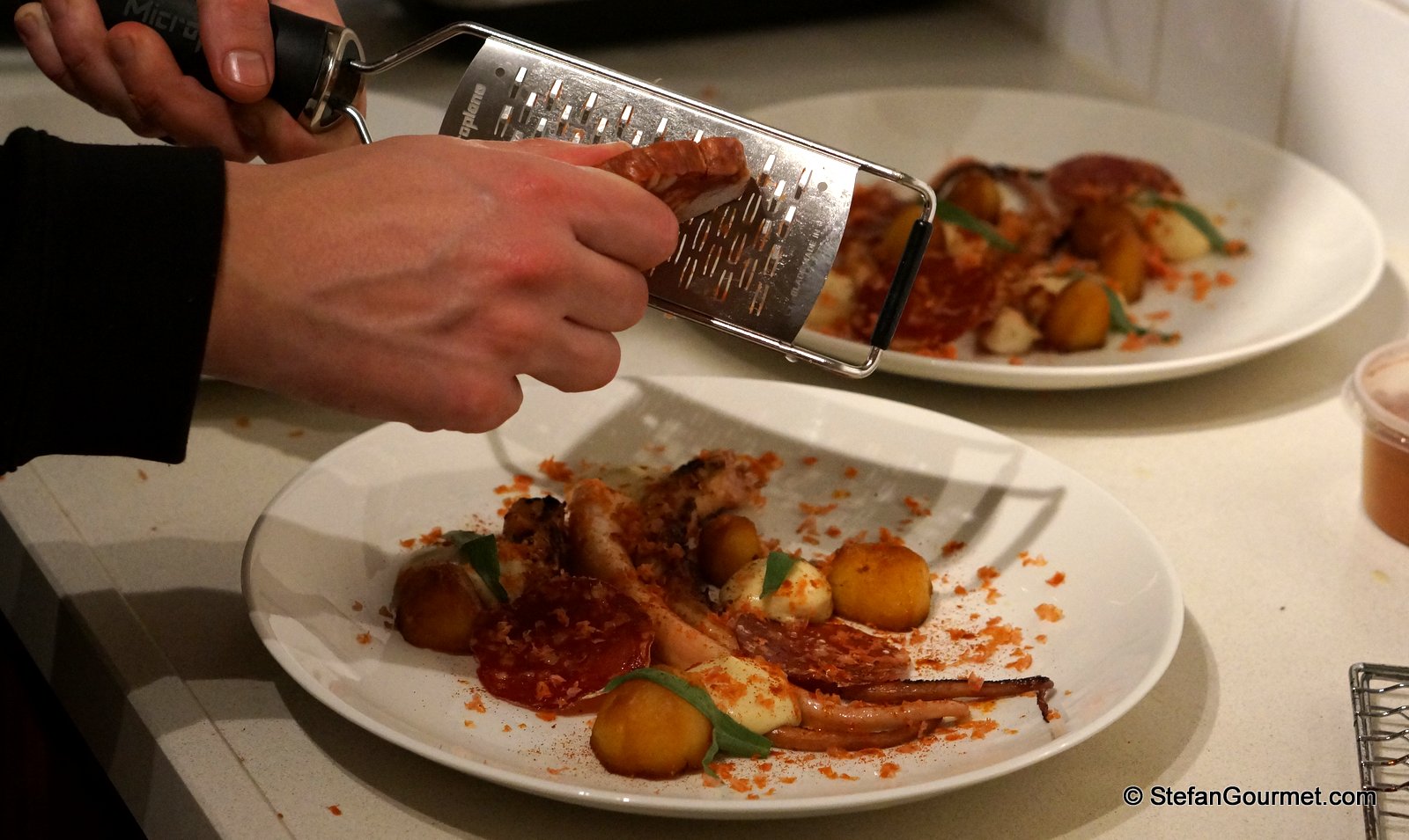 Grate frozen chorizo with microplane grater over octopus.