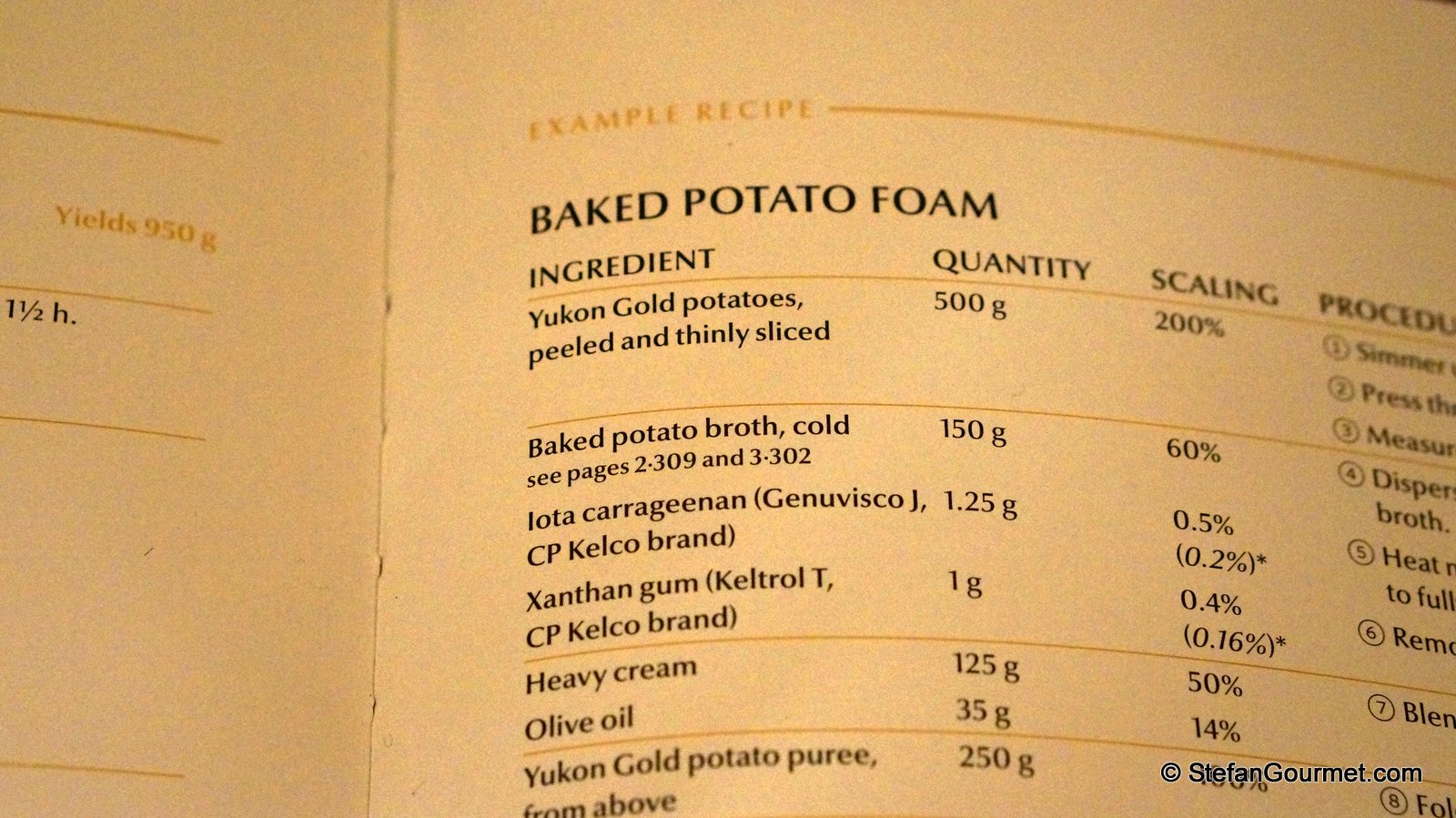 Then on page 4-281, the ingredients for baked potato foam include baked potato broth, “see pages 2-309 and 3-302”. You can also see here that the ingredients for baked potato foam contain unusual ingredients such as “Iota carrageenan” and “Xanthan gum”. This is typical of most recipes in Modernist Cuisine.