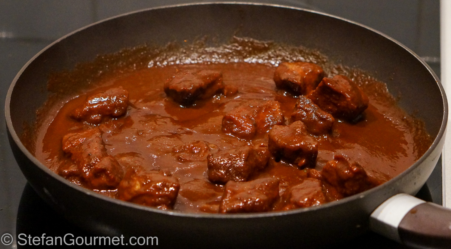 Remember that the meat is only 57ºC/135ºF, so for serving it is better to heat it up for a few minutes over medium heat in a non-stick frying pan, stirring.