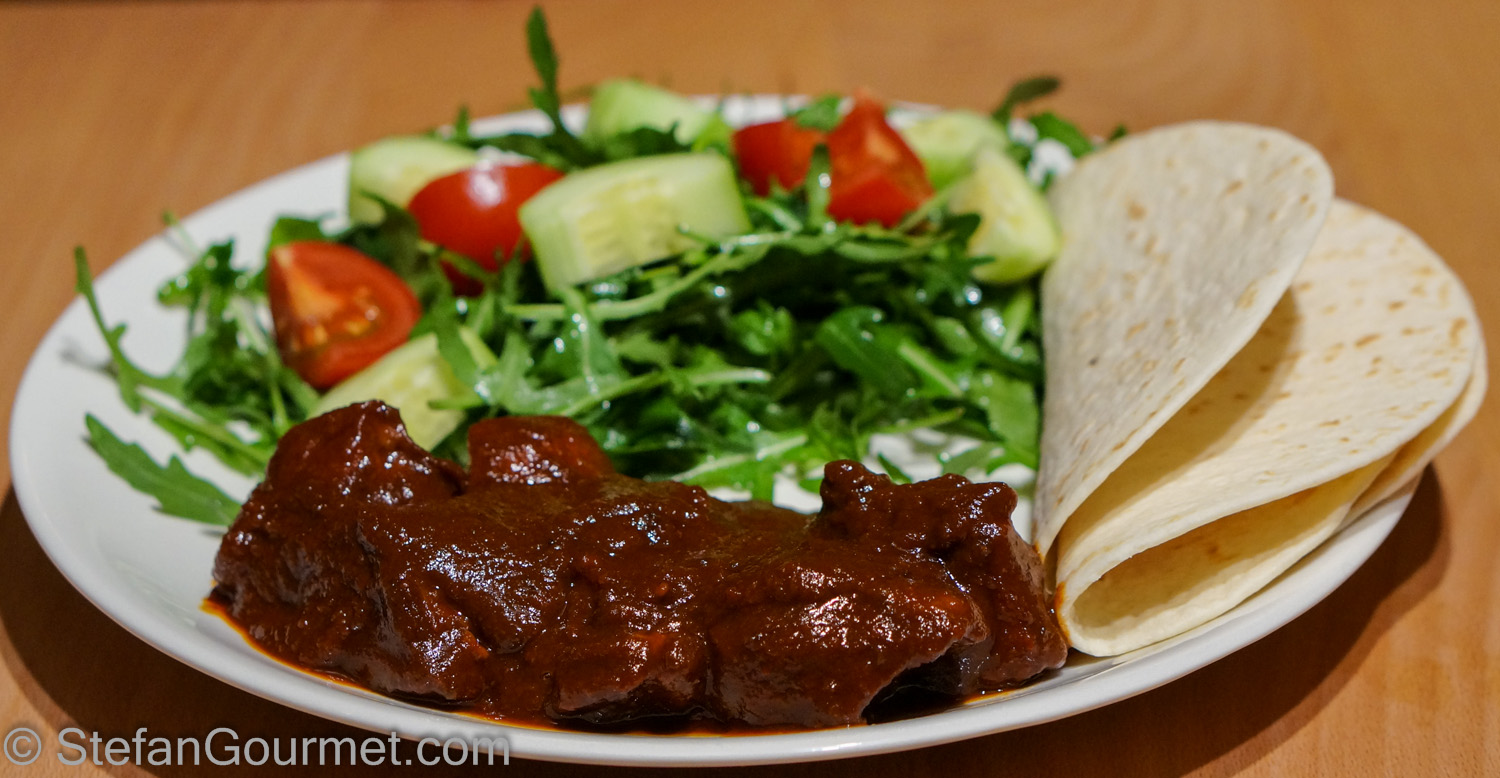 It was no surprise at all that the first recipe of 2014 on REMCooks.com was a chile recipe. This pork dish from New Mexico seemed fairly straightforward and delicious, and I thought it would be nice to tweak it just a little and use pork stock and cook the pork sous-vide. Pork shoulder is cooked in a sauce of dried chiles and spices. The first time I made the mistake of cooking it along with a smoked ham hock in the same sous-vide water bath, which imparted an unpleasant bitter aftertaste to the dish. I made it again and then it turned out delicious. Thanks, Richard!