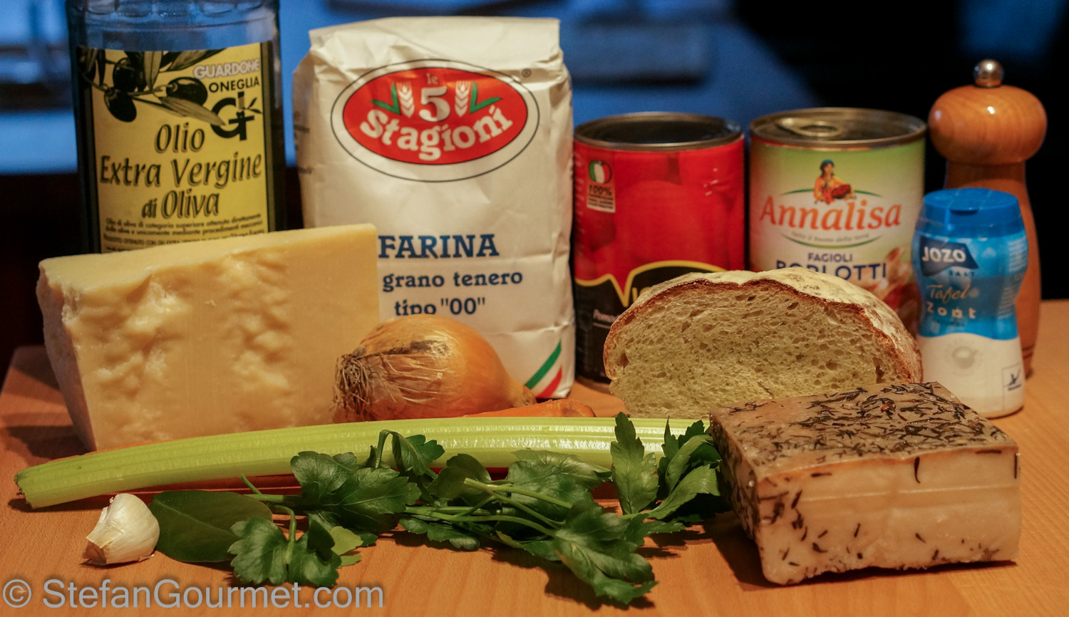 Pisarei are small gnocchi made of breadcrumbs, water and flour. Yes, this is a poor man’s dish that was created to use up leftover bread. The gnocchi should be small, about the same size as the beans. Fasö is the word in the local dialect of Piacenza for borlotti beans. The other ingredients are lard, tomatoes, and the holy trinity of carrot, onion, and celery. Cristina’s and Marina’s recipes are very similar. The only thing I’ve done differently is that I’ve used canned borlotti beans rather than cooking them myself. The main reason for that is that I could only find them canned, not dried.