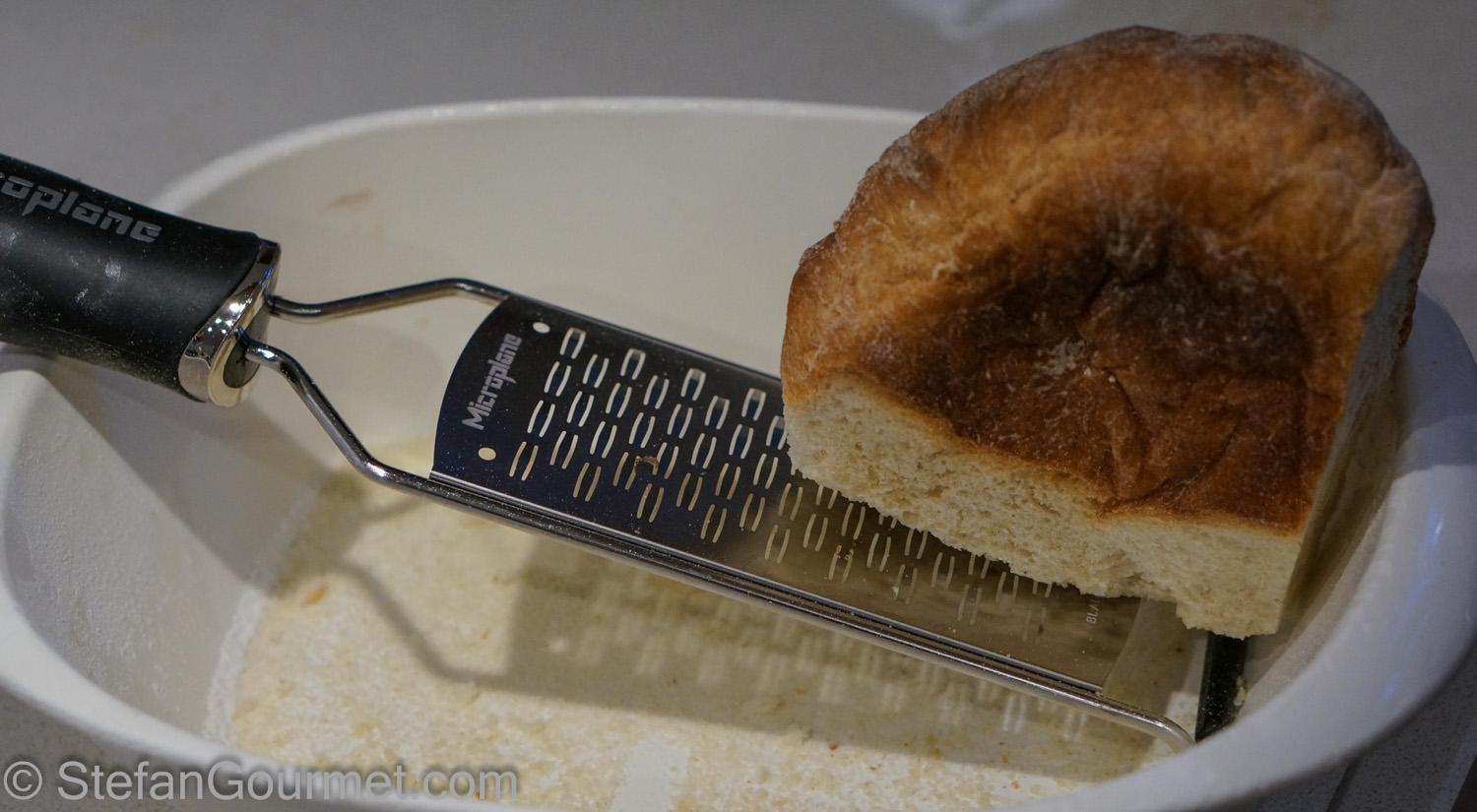Combine the breadcrumbs and the flour in the bowl of a stand mixer fitted with the paddle attachment. (Of course you could also knead the dough by hand.)