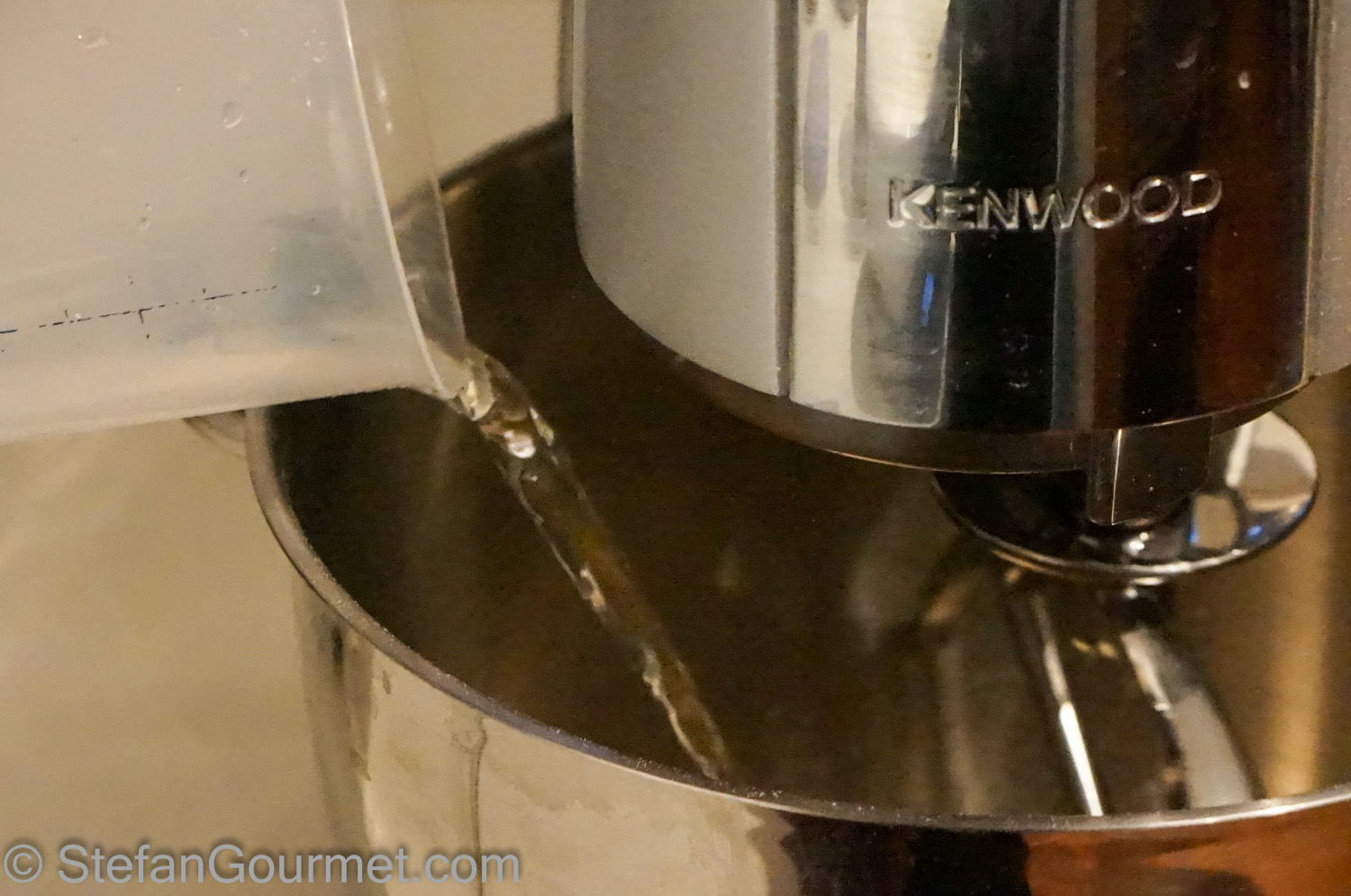 Turn on the machine and slowly add the water. Add just enough to bring the dough together.