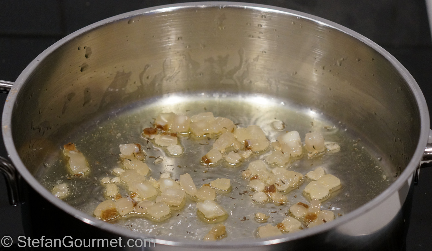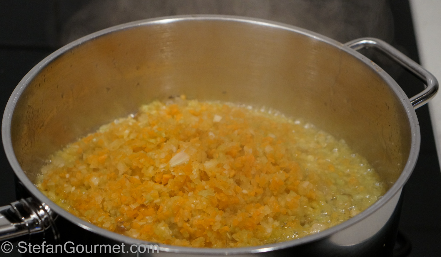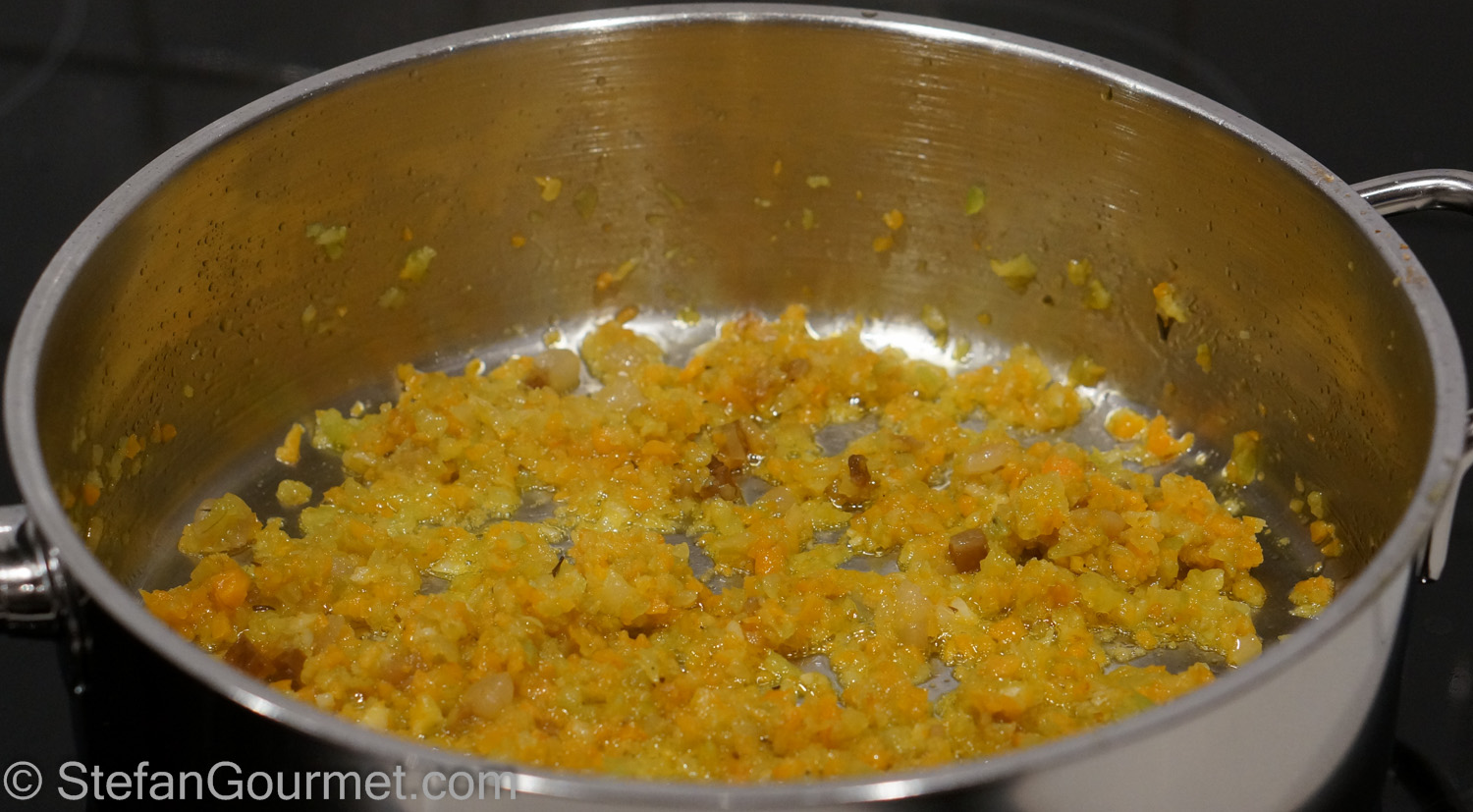 After a minute, add the finely minced onion, carrot, celery, and garlic. (I used the food processor to mince them.)