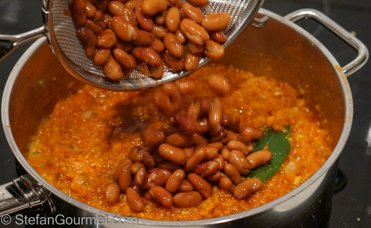 After 15 minutes of sommering, drain the beans and add them tot he tomato sauce. Stir and allow to simmer for 5-10 minutes.