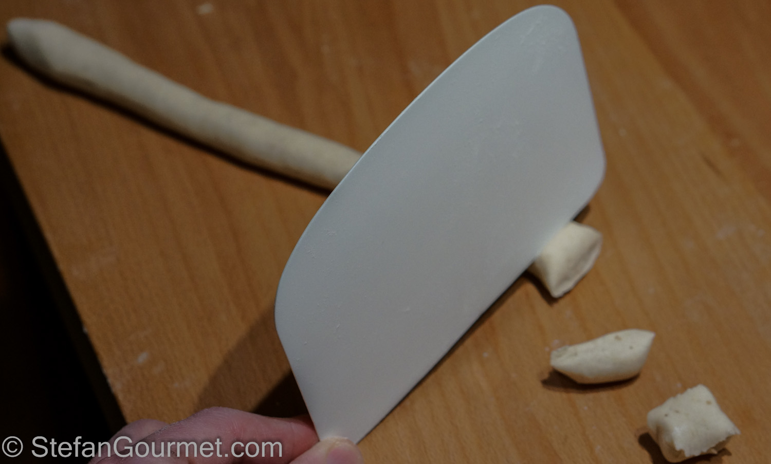 Meanwhile, take a piece of the dough and on a floured work surface (preferably wooden, that works best) roll out into a thin sausage.