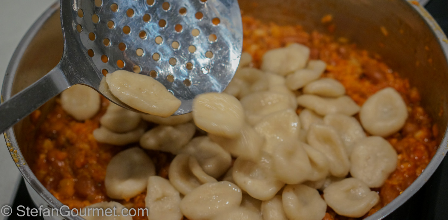 Pick up the pisarei with a slotted spoon as they rise to the surface…