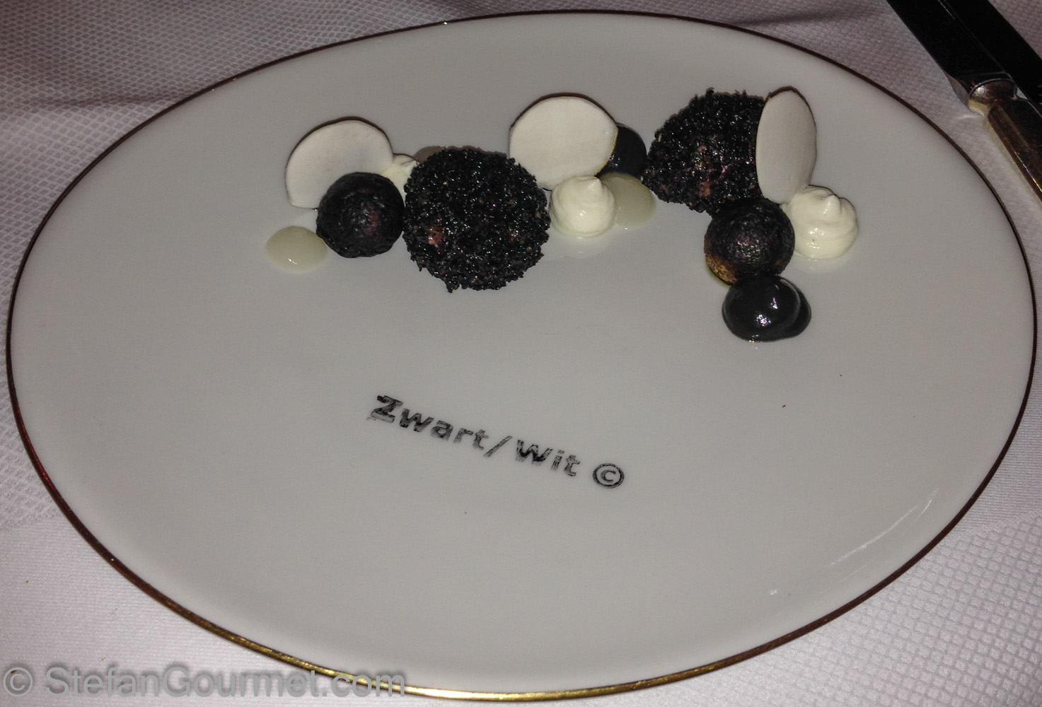 Valrhona ‘Dulcey’ white chocolate with macademia, caramel and Maldon sea salt. A very nice combination of flavors and textures, although a bit less salt would have been nice even though salt and caramel go well together. The accompanying Pedro Ximénez would have been a better match for a dessert with white chocolate as it was a bit too strongly flavored. 8/10