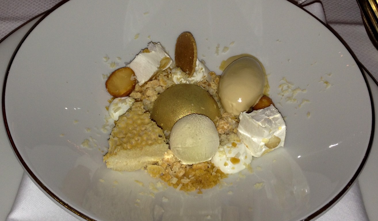 Iberico pork: jamón iberico (pata negra), grilled shoulder piece, and braised cheek (in a crunchy package), triple sherry jus, sweet potato, and black garlic. A very nice main course with perfectly cooked meat. I especially liked the layered ‘bar’ with jamón and sweet potato. Such a Spanish dish asks for a Spanish wine, and you can’t get more Spanish than tempranillo. The pairing was good, although not as good as the previous course. 8/10