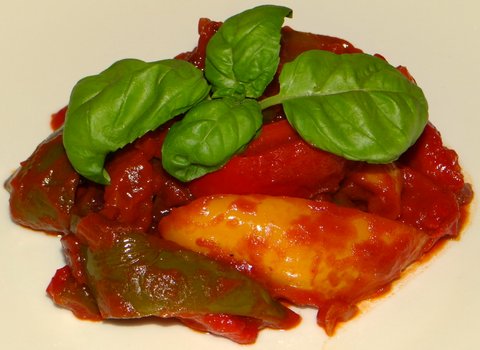 Peperonata is a classic Italian side dish with bell peppers, onions, and tomatoes. It is good with light meats such as chicken, rabbit or even frog legs. It is simple to make, healthy and very tasty. Instead of eating it as a side, you could also serve peperonata as pasta sauce over penne rigate, or even as a topping for crostini.