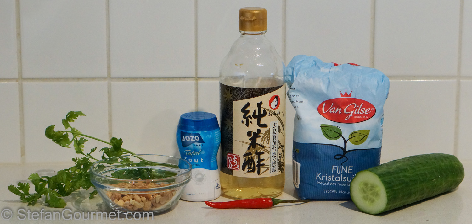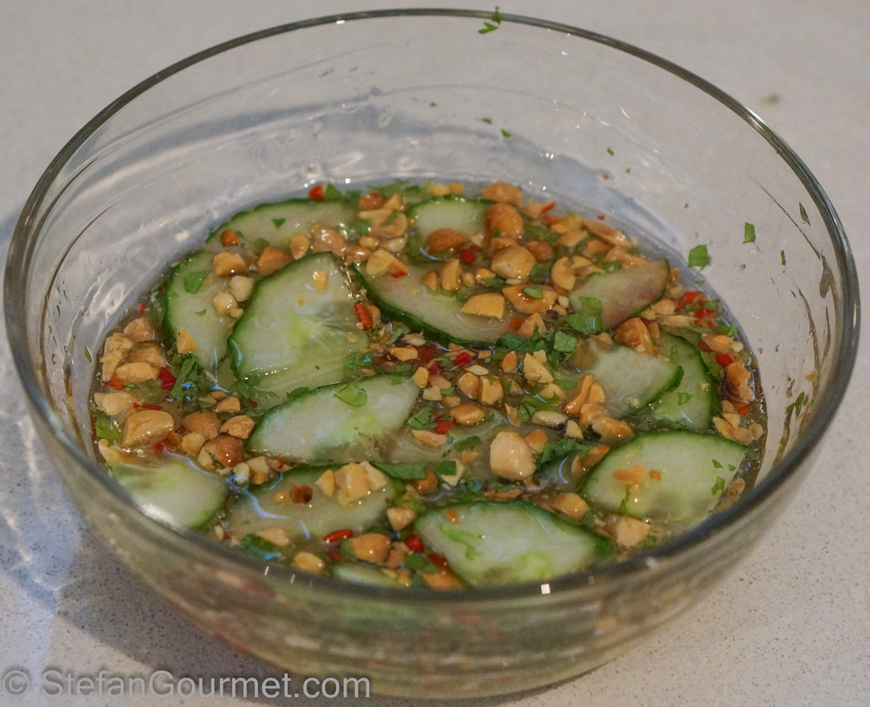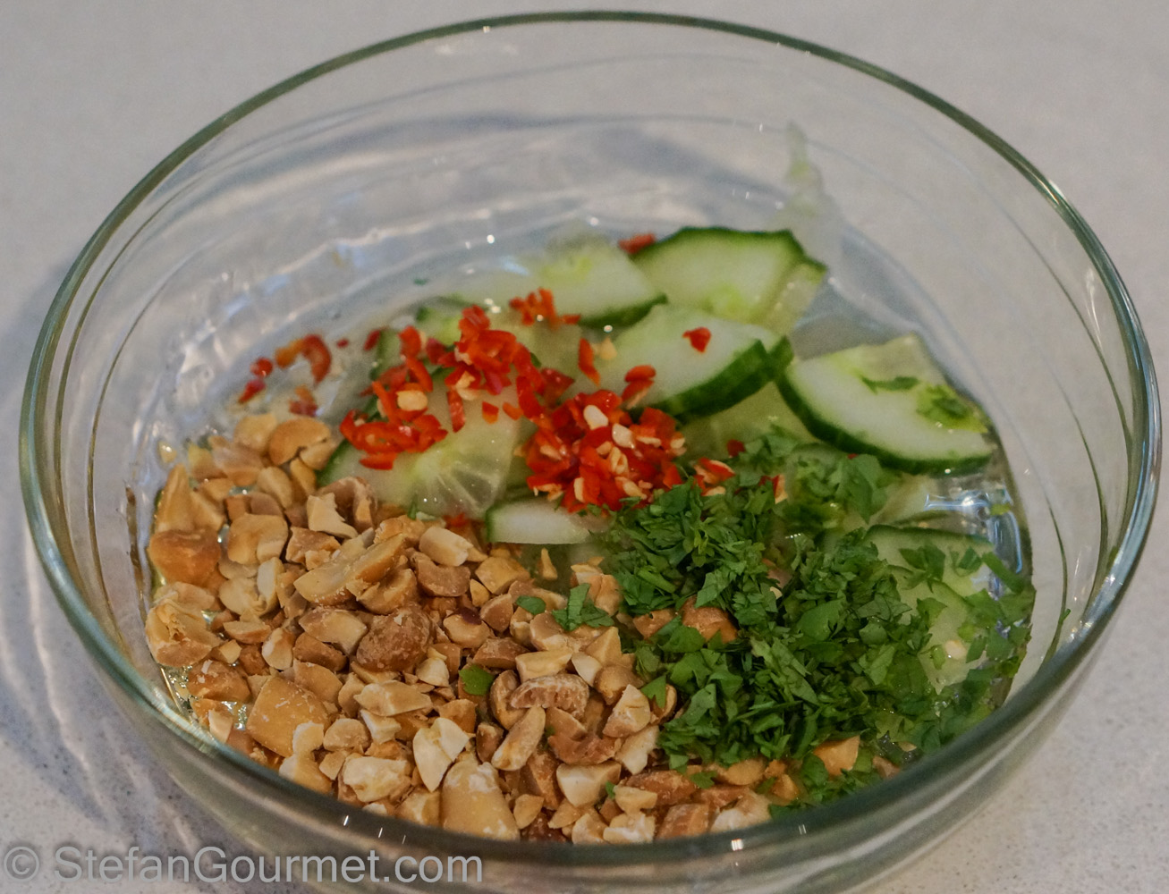 Add the peanuts, cucumber, chilli, and cilantro to the vinegar mixture. Remove the seeds and membranes from the chillis if you like it less hot.