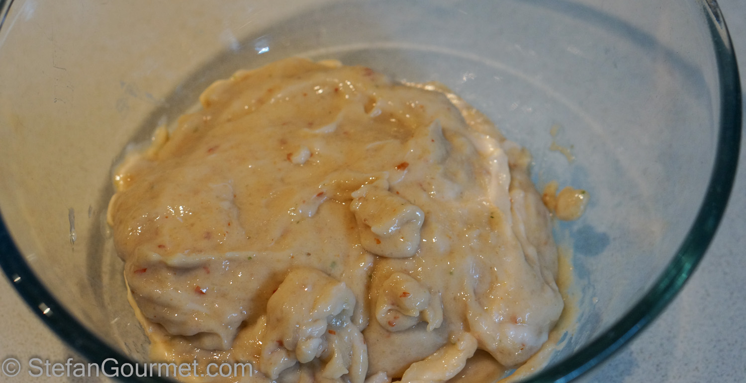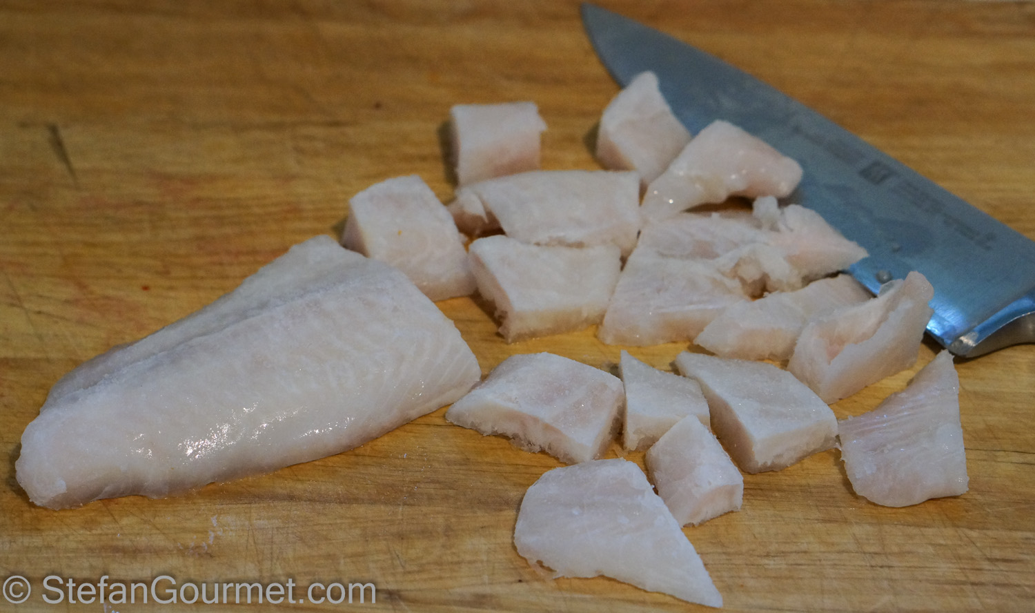 While the sauce is cooling, take the fish paste or make your own. For my first try I used frozen panga fillets that I cut into pieces…