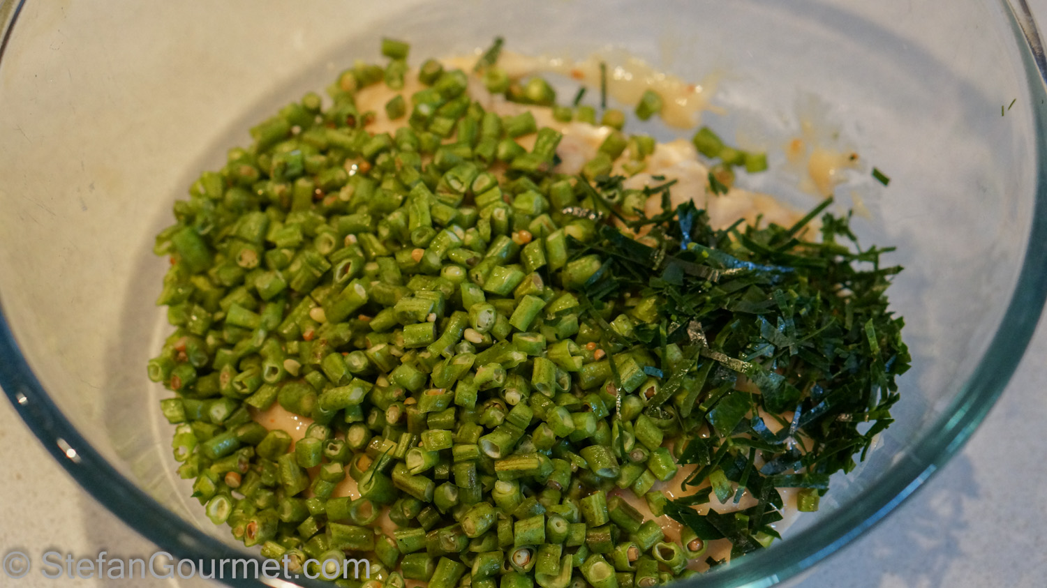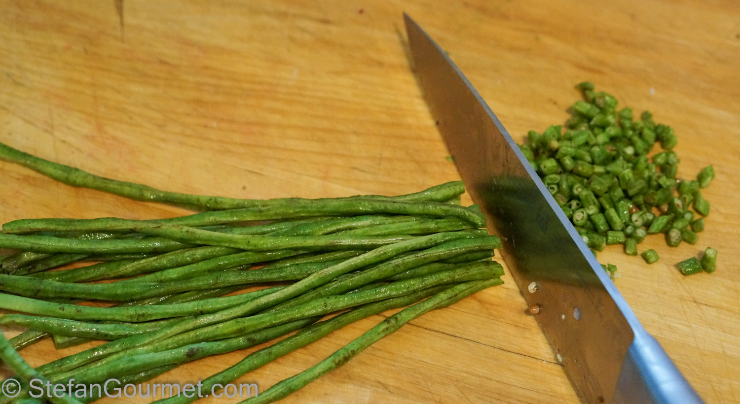 Cut the long beans into small pieces, about as long as the beans are thick.