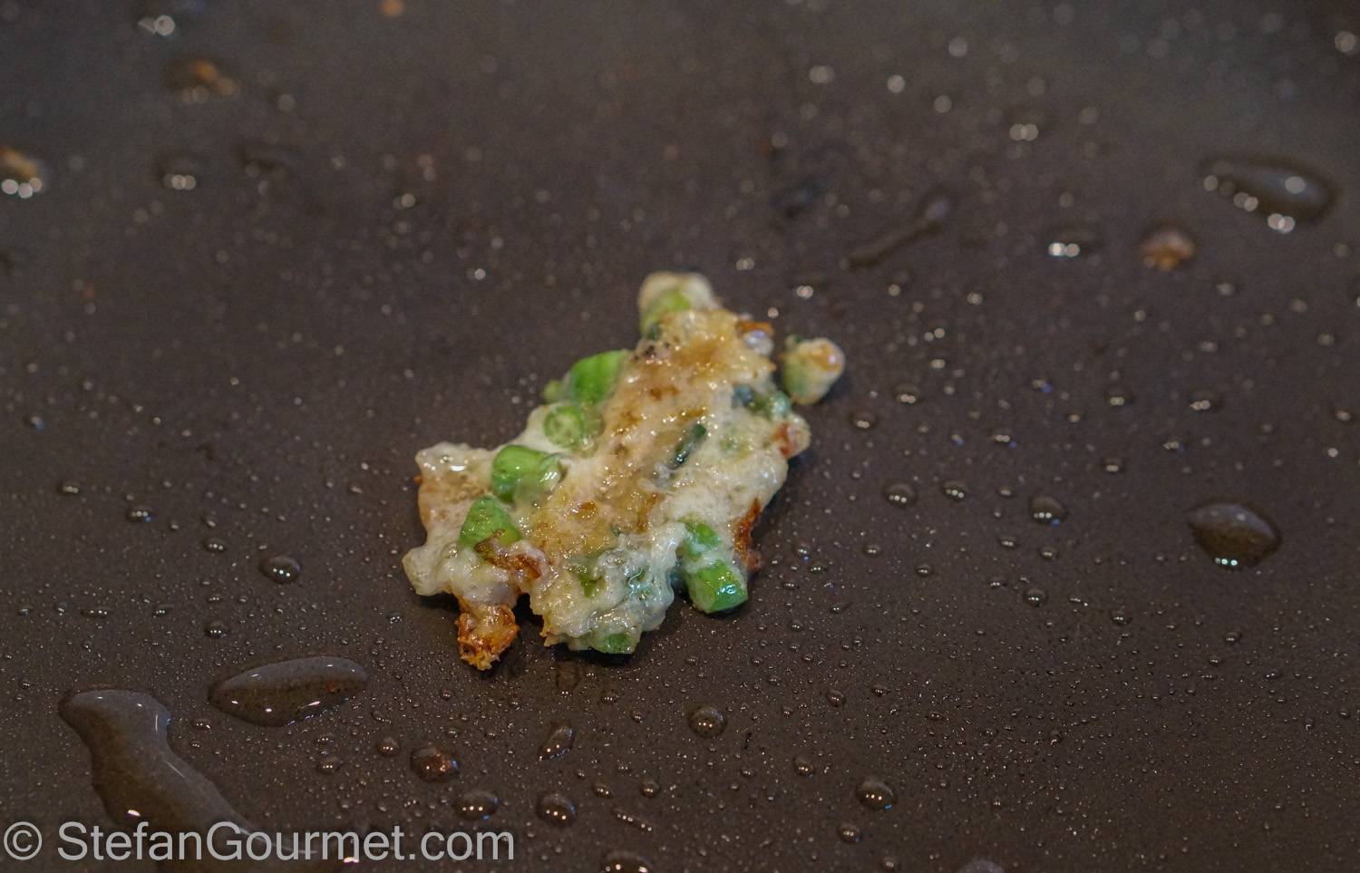 The resulting fish cakes didn’t stay together very well and ending up being small with a big ‘beard’ of crunchy fish. This is not how they are supposed to look. I am not sure to what extent this was caused by the wrong texture of the fish paste and/or by the oil temperature. They still tasted great, so I was encouraged to give it another try.