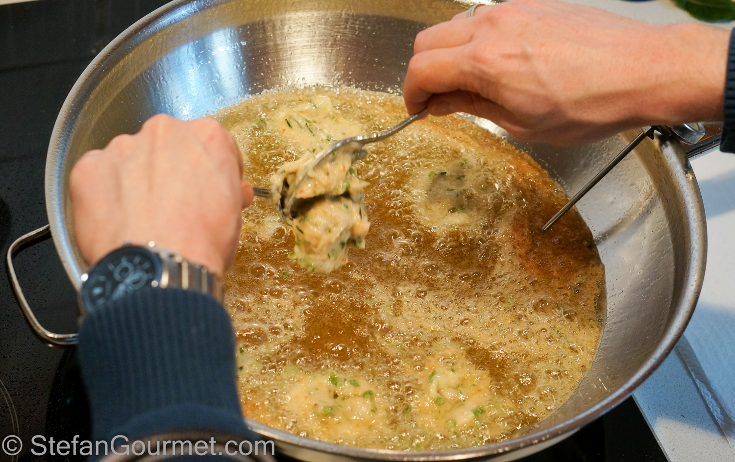 To fry the fish cakes, heat about 1.5 cm (1/2 inch) of oil in a non-stick frying pan. Heat the oil to 160ºC/320ºF. Make cakes using two spoons and lower them into the oil.