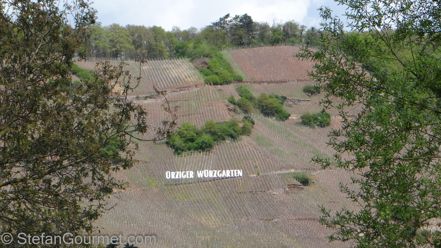 The names of the vineyards are sometimes shown, like Ürziger Würzgarten here (Ürzig is the name of the town, and Würzgarten means herb garden).