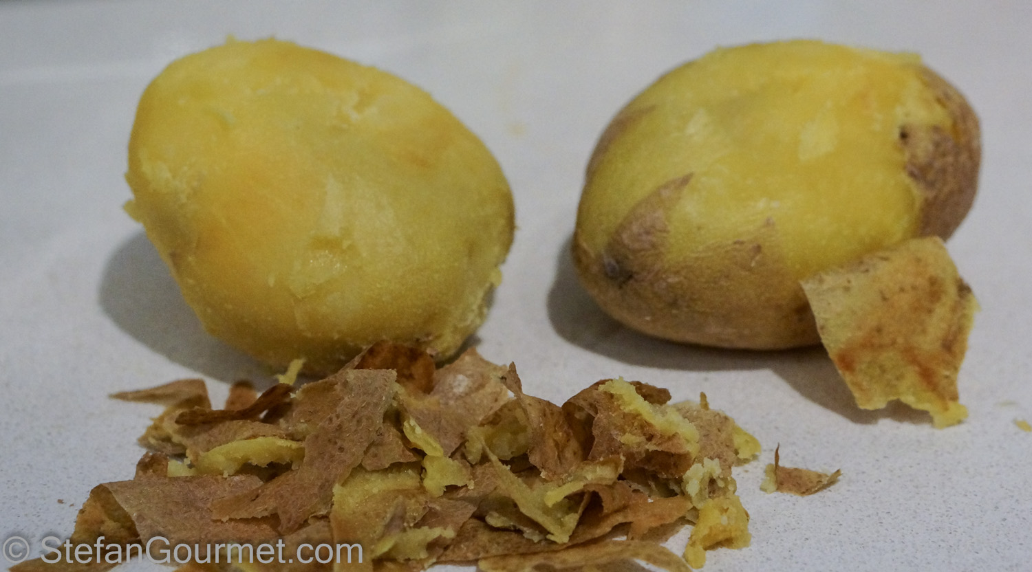 I love baking the potatoes on a bed of salt. It wicks even more moisture out and requires less eggs later on. A trick and recipe I learned from Paul Wolfert.