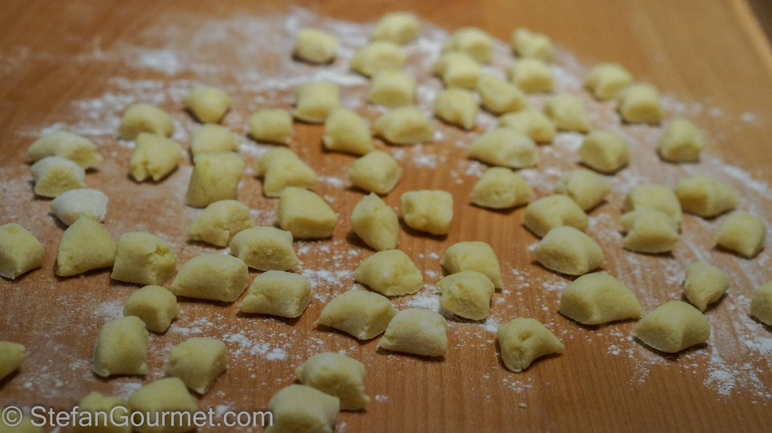 Repeat until you have used up all of the dough. As an optional step you can use the tines of a fork to make grooves in the gnocchi, but that is not really needed as they will hold the sauce well anyway.