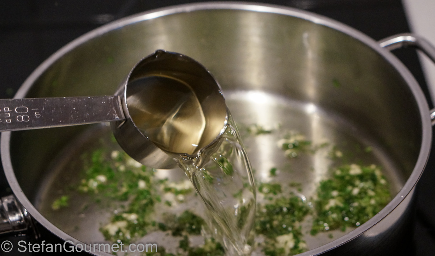 Add the white wine and stir for a minute until the alcohol has evaporated.