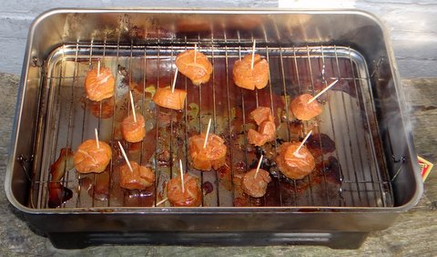Scallops are perfect for hot smoking and serving them as a snack with drinks, as they have just the right size. Just stick a toothpick in each and you are ready to serve. The smoke does overpower the delicate flavor of the scallops just a bit, but the resulting flavor and texture is delicious all the same.
