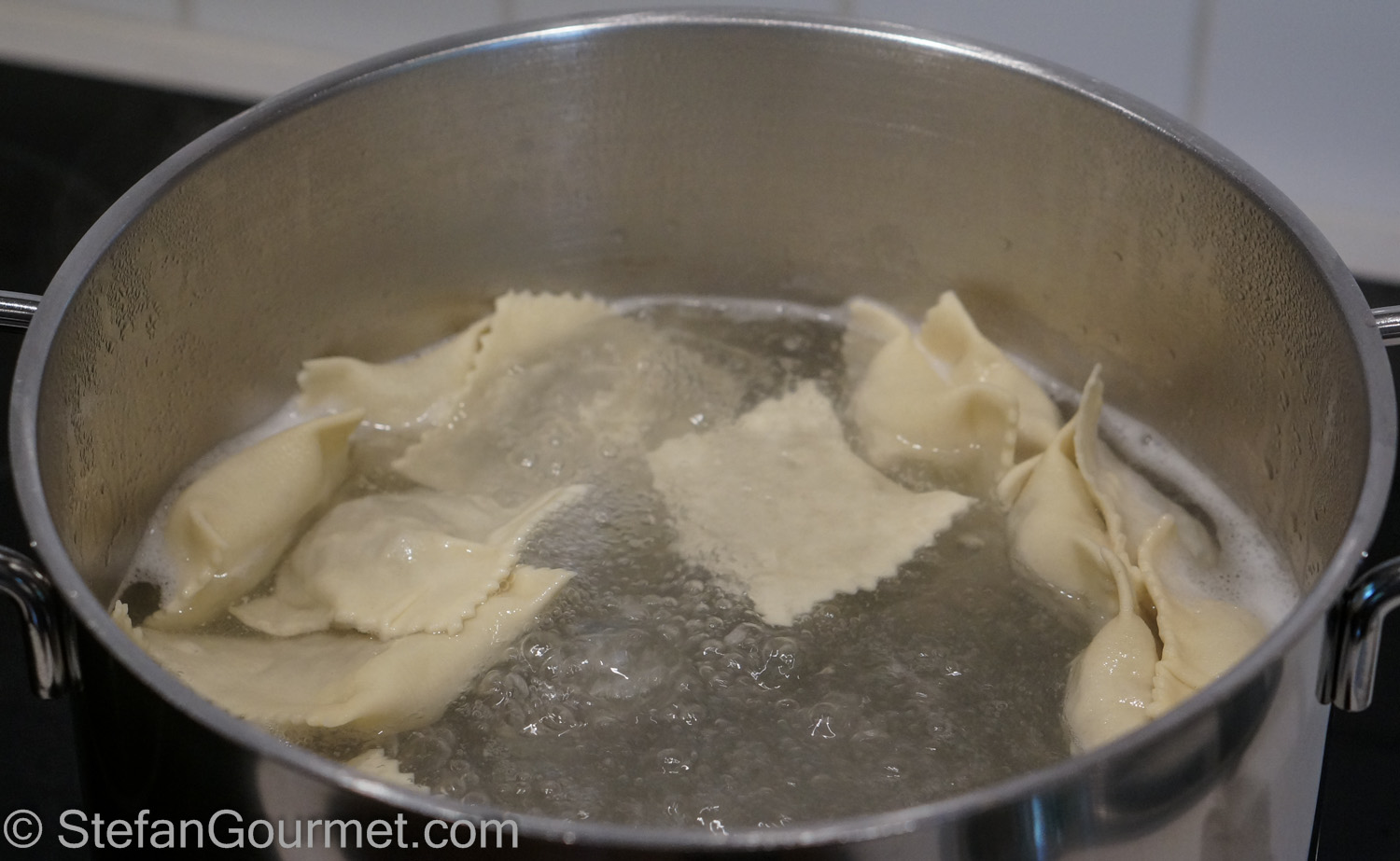 Roll out the pasta dough and make ravioli according to my instructions. Cook the ravioli for a couple of minutes in boiling salted water.