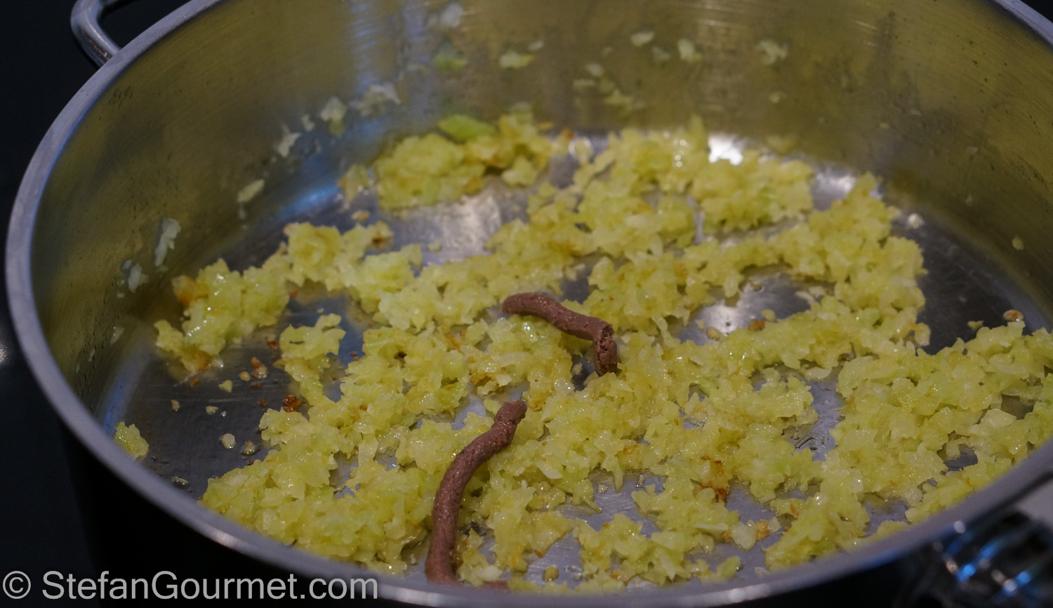 Sweat the onions, celery and garlic in 2 Tbsp olive oil over medium low heat until soft and fragrant, about 10 minutes. Add the anchovies or anchovy paste.