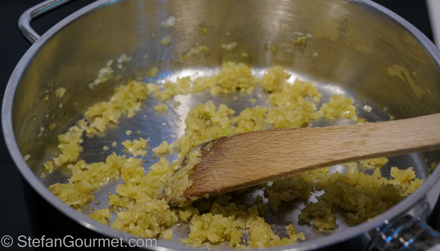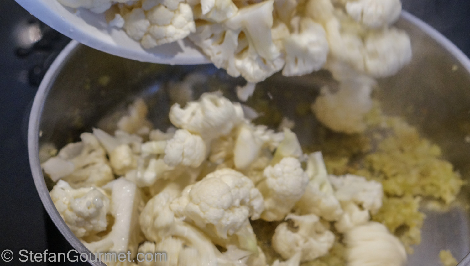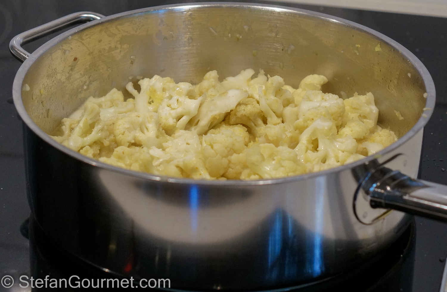 Cover and allow to simmer for at least an hour over low heat, stirring now and then. Add only a bit of water or white wine when absolutely necessary. It is fine if the cauliflower browns just a little, but it should not burn.
