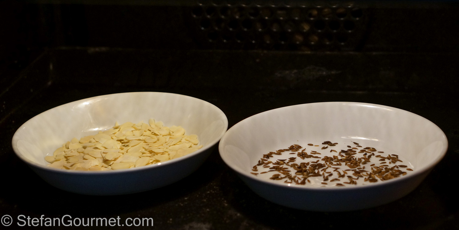 Roast the cumin seeds (5 minutes) and the slivered almonds (10 minutes) in the oven at 180C/350F.