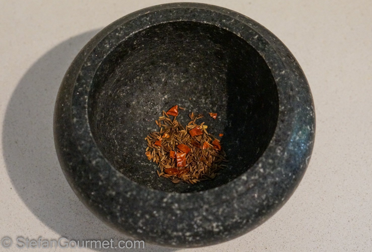 Put the cumin seeds and crumbled dried chile pepper (without the seeds) in a mortar.
