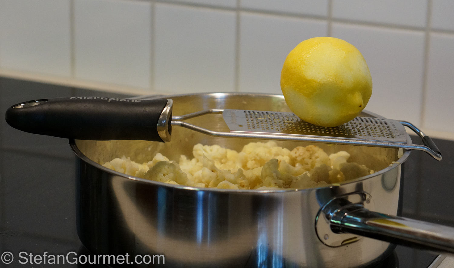 When I made my first batch of ravioli with a cauliflower stuffing some weeks ago, I contemplated whether I would make it with red wine or with white wine and ended up making a delicious red wine version with great depth of flavor. The idea of a ‘fresher’ version with white wine and lemon lingered, and so I decided to make that one as well. The result was equally delicious, but lighter and fresher. Both cauliflower ravioli recipes are great, it depends on what type of flavor you’re looking for and what wine (red or wine) you’d like to drink with them. The technique is the same: braising the cauliflower gives these ravioli great depth of flavor. The trick is to balance the other ingredients such that they blend into one flavor with the cauliflower rather than tasting the individual elements.