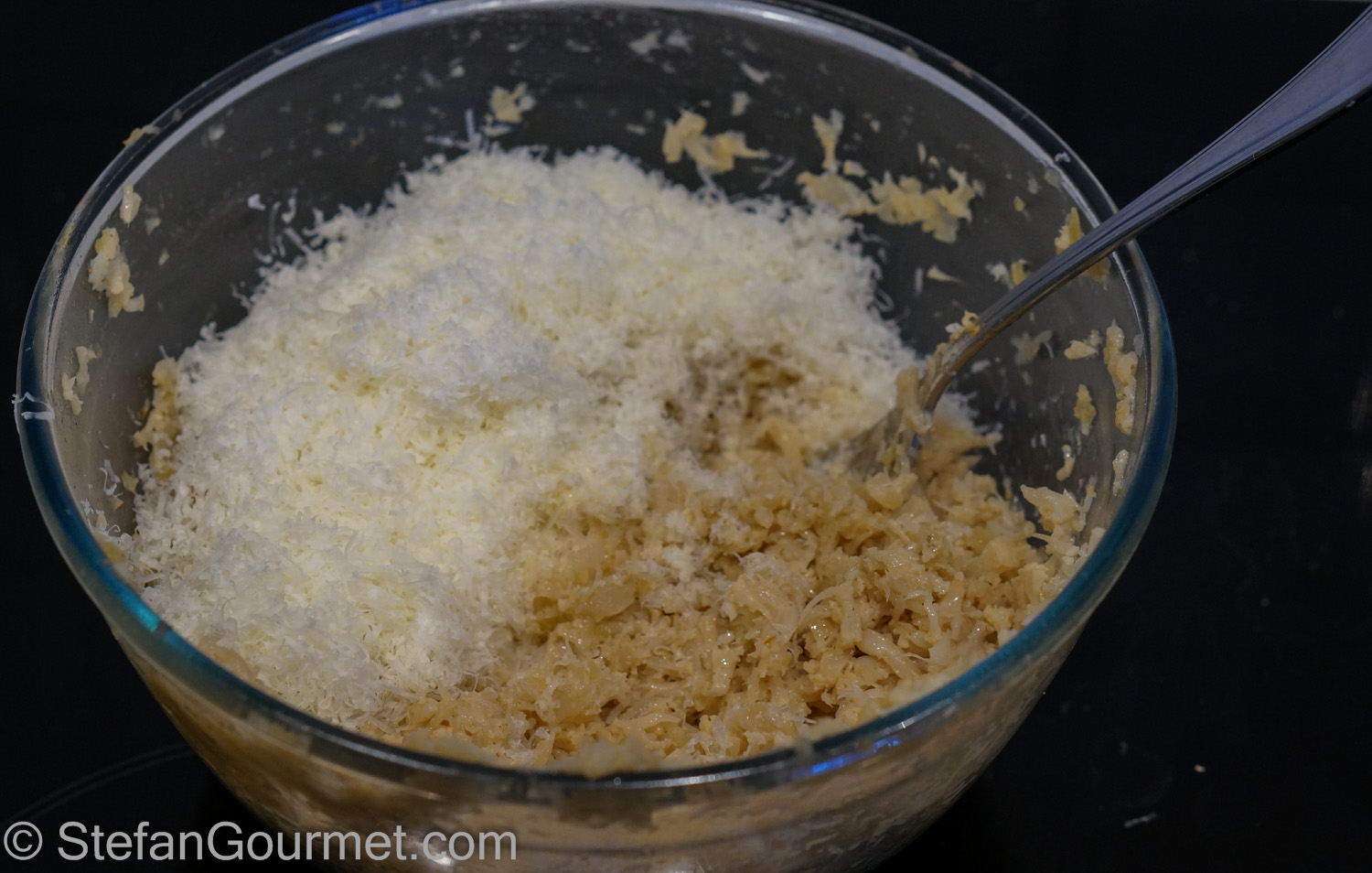 Add most of the freshly grated pecorino cheese and about 3 Tbsp of extra virgin olive oil and continue to mash to incorporate the cheese into the mixture.