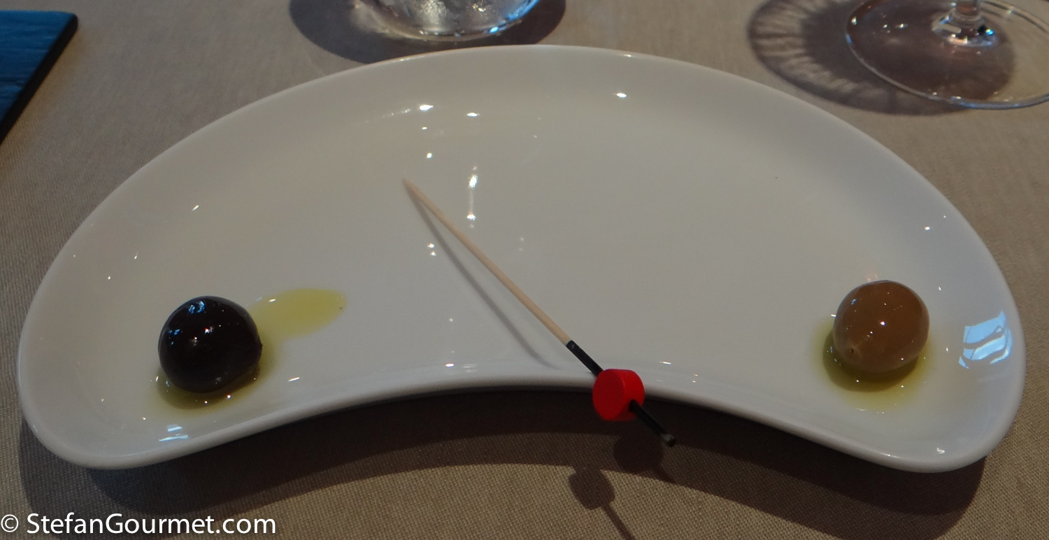 These fake olives were delicious. They had a very nice olive taste and also the texture was like an olive, but the flavors were much more complex. The green one included veal.
