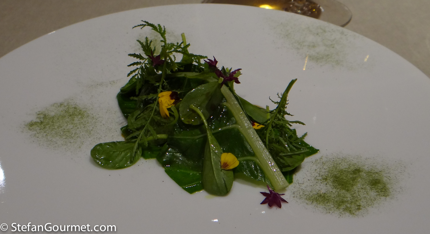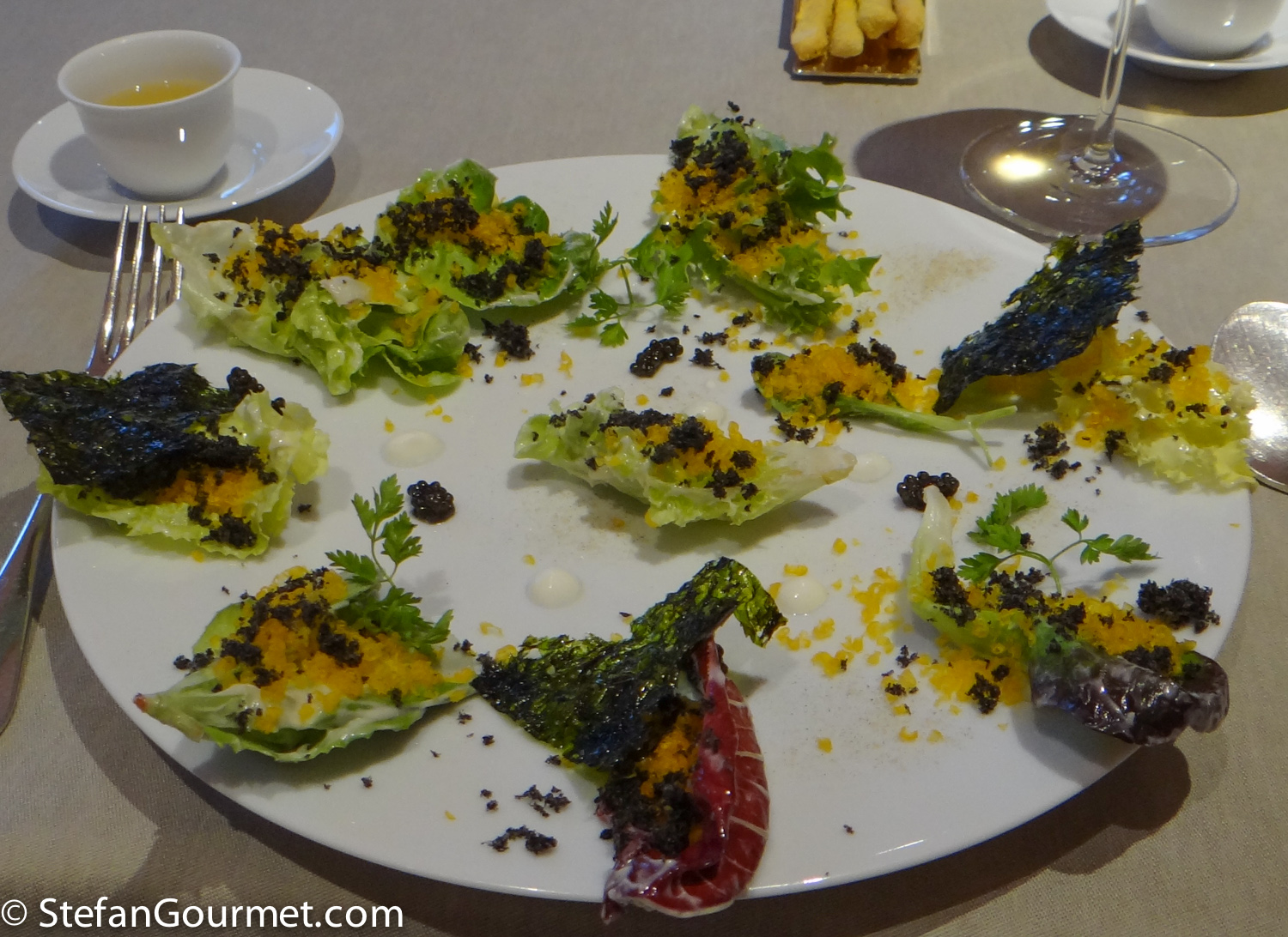 The first course, “eggs and egg salad” consisted of several types of lettuce with grated egg yolk, caviar, and sea weed, with a stock on the side that we were instructed to sip in between bites of the salad. Very original dish with great flavors. 10/10