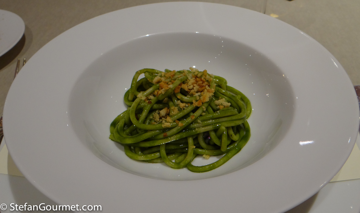 For the wine there are different percorsi on offer: 4, 5 or 6 glasses, just from Piemonte or also from ‘everywhere else’. With 6 glasses and 11 courses we could foresee a difficult wine pairing, and so we asked the sommelier to see if he could include more different wines for us. There was some misunderstanding, as what he ended up doing was giving us each a different wine in 3 of the 6 cases. This was nice, as we could sip from each other’s glasses to see which one worked better with the food.