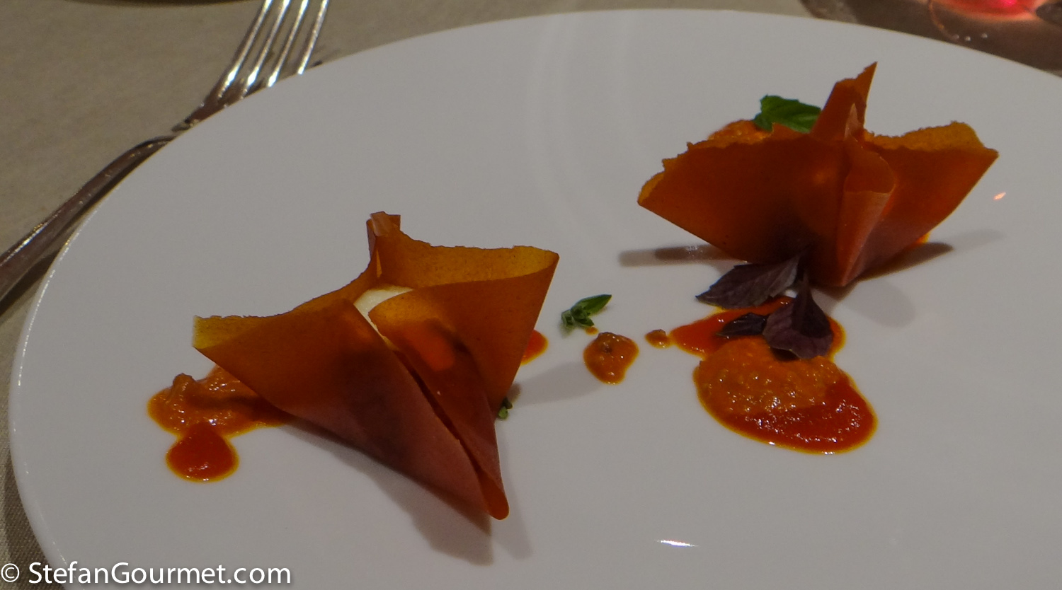 A crispy potato taco stuffed with tender and juicy red mullet, served with four different sauces. Technically very difficult, creative, as well as delicious. 10/10